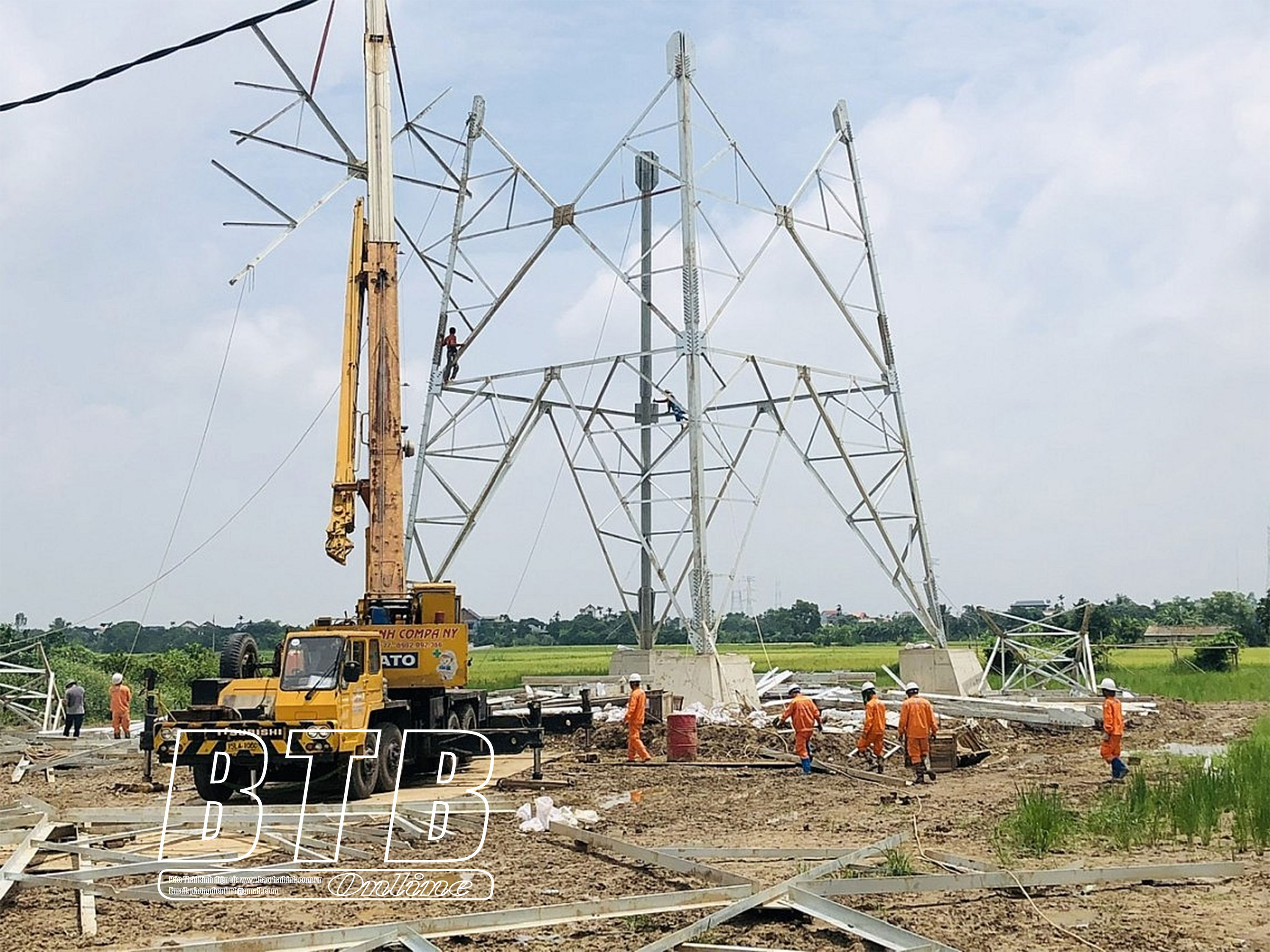 Tại vị trí cột 129 thuộc địa bàn xã Tự Tân (Vũ Thư), hàng chục công nhân thợ điện của Công ty Điện lực Thái Bình phối hợp với đơn vị thi công dãi người trong nắng nóng như thiêu như đốt vận chuyển, lắp ráp các cấu kiện thép và đưa lên dựng cột. Dù làm việc vất vả nhưng ai cũng vui vẻ và luôn nhắc nhau “ăn tranh thủ, ngủ khẩn trương”, “một người làm việc bằng hai” phấn đấu sớm hoàn thành phần xây lắp cột để chuẩn bị kéo dây.