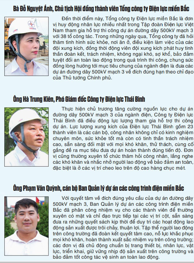 Ông Đỗ Đức Thiện, Tổng giám đốc Tổng công ty Điện lực miền Bắc cho biết: Trong điều kiện thi công đường dây 500kV mạch 3 gặp nhiều khó khăn nhưng các kỹ sư, công nhân thuộc các đơn vị ngành điện lực đã nỗ lực hết mình, không quản ngại gian khó, quyết tâm hoàn thành nhiệm vụ được giao.