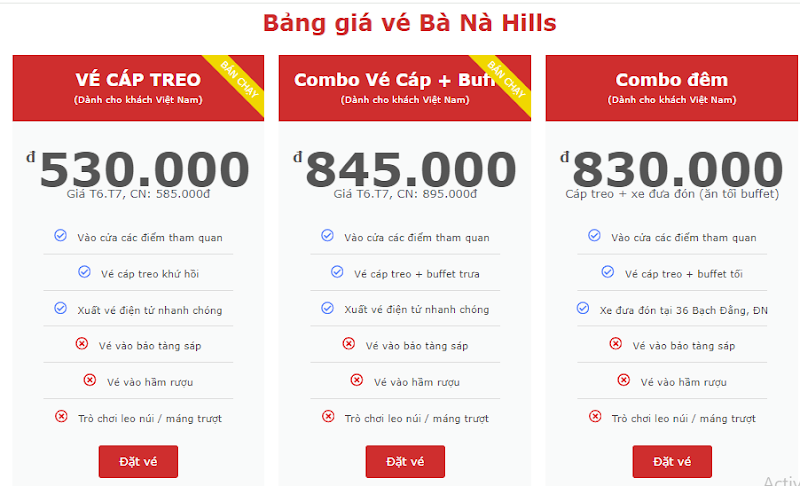 Bảng giá cụ thể vé Bà Nà Hills như sau: