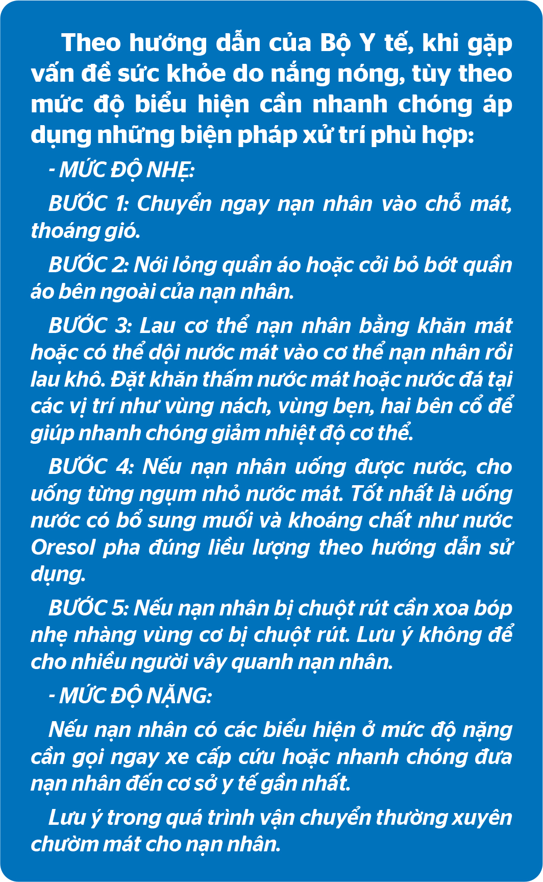 Hiện nay, nắng nóng gay gắt đúng thời điểm người dân đang thu hoạch lúa. Người làm việc liên tục ngoài đồng, phơi thóc lúc nắng nóng cũng như lao động tại các công trình xây dựng, lao động ngoài trời liên tục... có thể bị mệt mỏi, váng đầu, say nắng, say nóng. Do đó, bác sĩ Lã Mạnh Lãm khuyến cáo: Với thời tiết nắng nóng như hiện nay, bất cứ ai cũng có nguy cơ bị say nắng. Nếu không được cấp cứu kịp thời, bệnh nhân có thể bị suy thận, ảnh hưởng đến não, tim, thậm chí là tử vong. Người dân phải ra ngoài khi trời nắng nóng cần che kín cơ thể bằng cách mặc quần áo rộng, nhẹ và sáng màu, đội mũ rộng vành; không làm việc quá lâu dưới trời nắng hoặc trong môi trường nóng bức, tránh các hoạt động thể lực quá sức; luôn trang bị đầy đủ các thiết bị chống nắng, chống nóng. Khi vừa đi nắng về, cơ thể tiết ra nhiều mồ hôi, nhiệt cơ thể cao không nên tắm ngay vì sẽ thay đổi thân nhiệt đột ngột có thể dẫn đến đột quỵ. Mùa nắng, người dân cần uống nhiều nước, ăn nhiều rau xanh, củ quả; không để trẻ em hoặc bất kỳ ai trong xe hơi đỗ, tắt máy. Bên cạnh đó, tránh thay đổi nhiệt độ đột ngột từ môi trường điều hòa ra ngay trời nắng, nóng. Với người bệnh có tiền sử đột quỵ não, bệnh tim mạch, ngoài thực hiện các khuyến cáo ở trên cần duy trì đều việc uống thuốc hoặc các biện pháp dự phòng; chủ động khám sức khỏe định kỳ; không để nhiệt độ điều hòa quá lạnh; uống đủ nước và bảo đảm dinh dưỡng hợp lý. Một giờ sau khi bị say nắng, say nóng ở mức độ nặng được gọi là “thời điểm vàng” để cấp cứu. Vì thế, cấp cứu say nắng, say nóng phải hết sức chú ý đến việc cấp cứu ban đầu tại hiện trường.