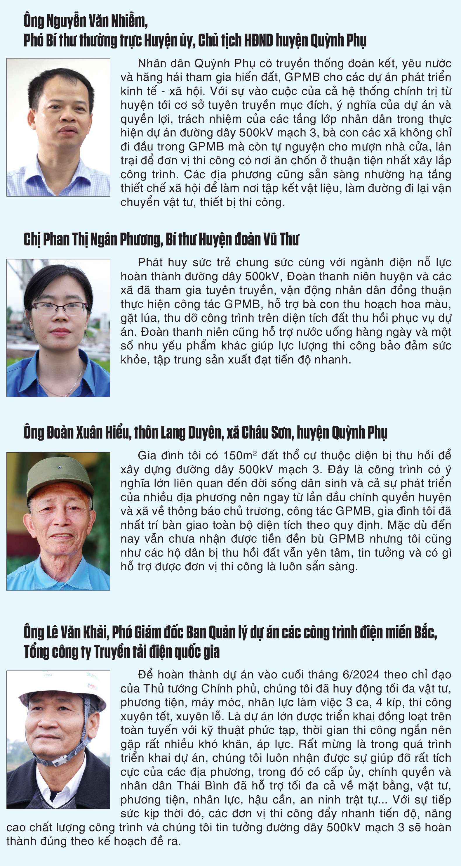 Ông Vũ Đức Ninh, Phó Giám đốc Trung tâm Phát triển quỹ đất và Cụm công nghiệp huyện Quỳnh Phụ cho biết: Quá trình đo đạc, kiểm đếm tài sản, đất đai, lập phương án đền bù, hỗ trợ, chúng tôi công khai, minh bạch mọi quy định và chế độ, chính sách về GPMB đối với dự án đường dây 500kV mạch 3. Một số trường hợp còn băn khoăn chưa thực hiện, huyện cùng với các xã tích cực tuyên truyền, vận động, nắm bắt tâm tư và kiên trì giải thích để bà con hiểu. Người dân được phát huy quyền làm chủ, tin tưởng vào cơ quan chức năng nên dù chưa nhận tiền hỗ trợ, đền bù GPMB nhưng vẫn yên tâm bàn giao đất. Chỉ hơn 2 tháng triển khai, huyện Quỳnh Phụ đã cơ bản hoàn thành thu hồi toàn bộ diện tích đất phục vụ dự án.
