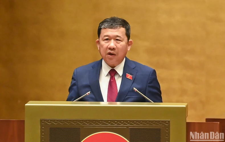Chủ nhiệm Ủy ban Đối ngoại Vũ Hải Hà báo cáo giải trình, tiếp thu, chỉnh lý dự thảo Nghị quyết trước khi Quốc hội bấm nút thông qua. (Ảnh: DUY LINH).