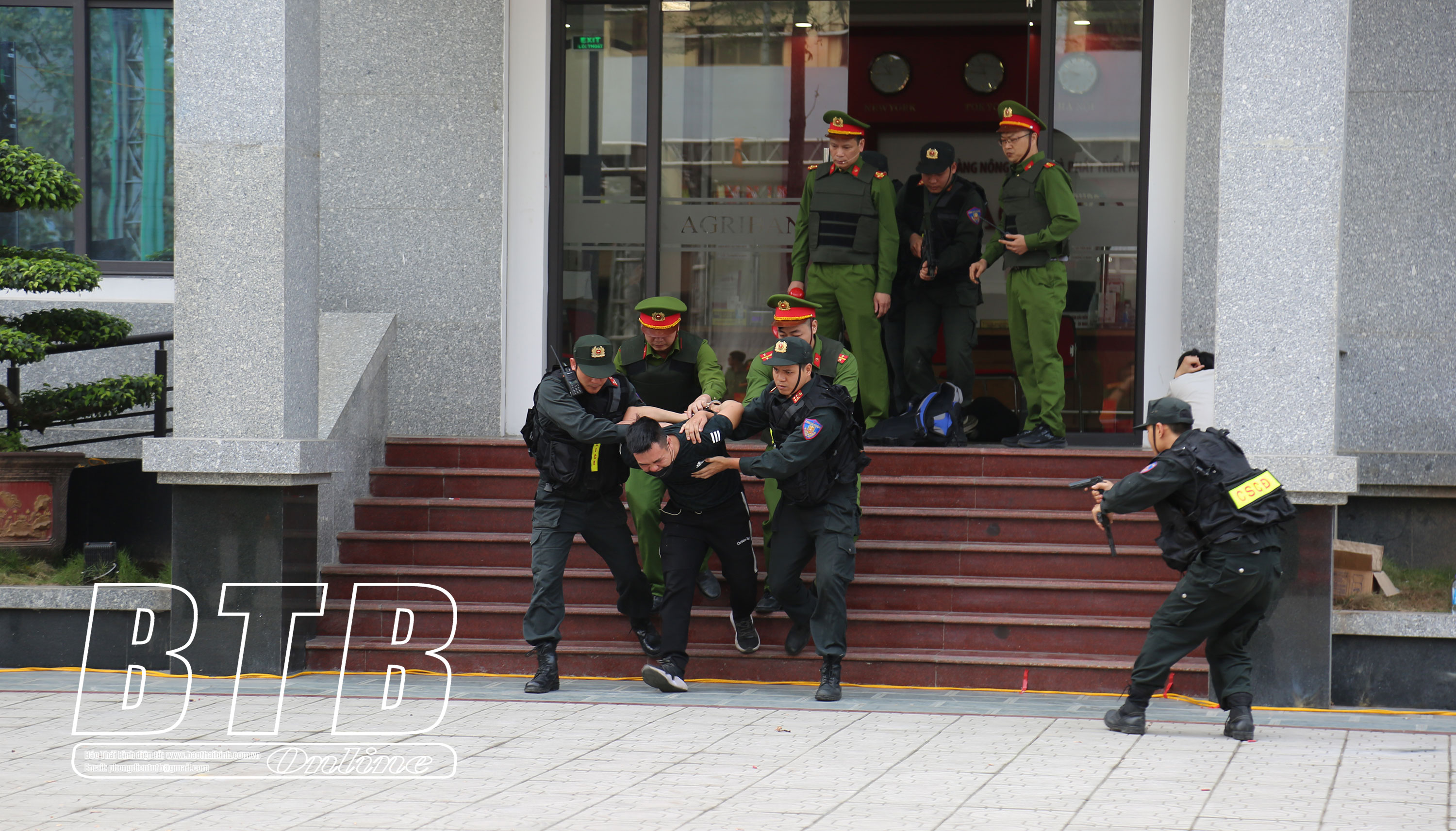 Lực lượng Cảnh sát cơ động diễn tập tình huống phối hợp chống cướp ngân hàng trên địa bàn.