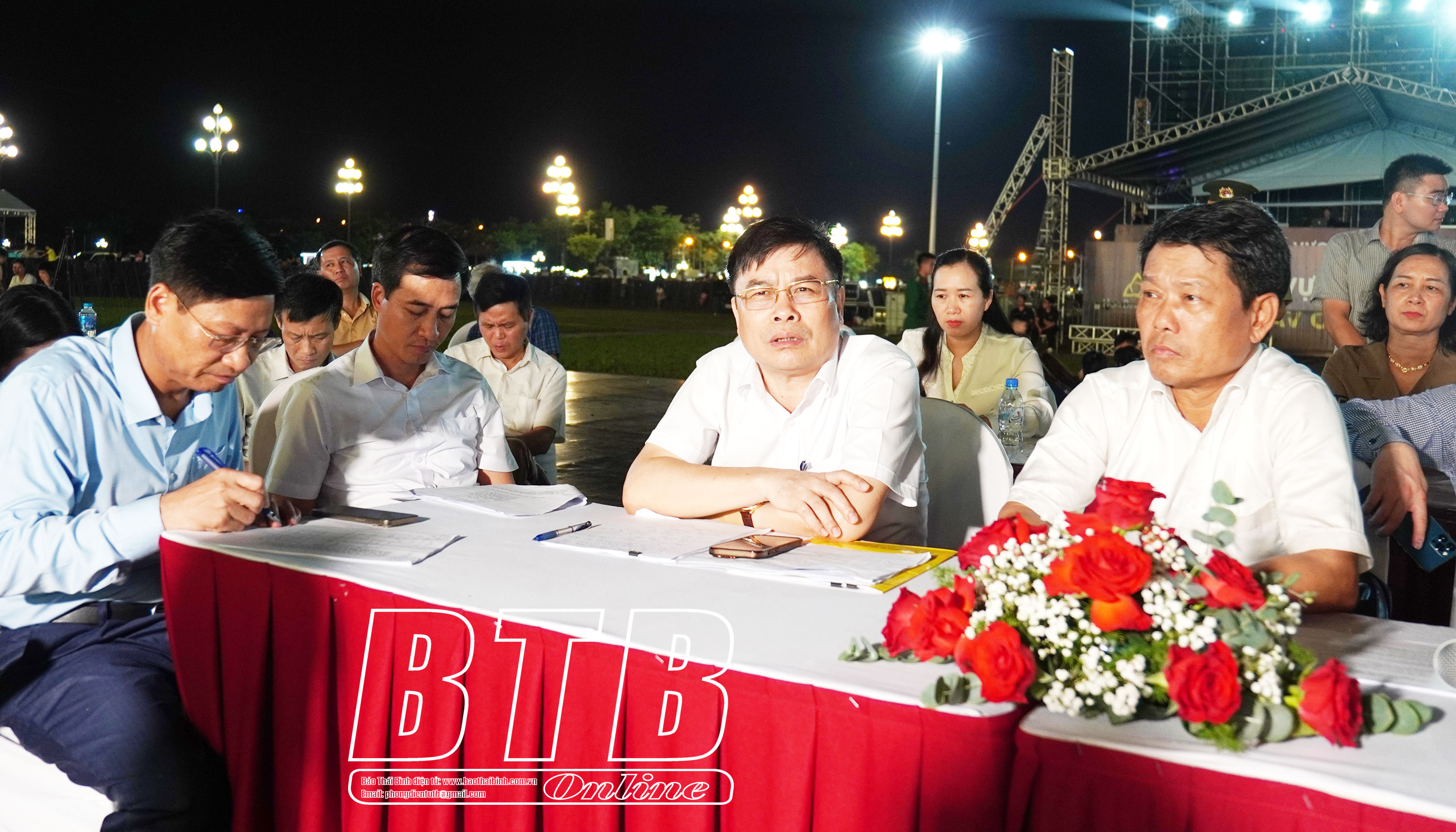 Các đồng chí: Phạm Văn Nghiêm, Tỉnh ủy viên, Phó Chủ tịch UBND tỉnh, Trưởng Ban tổ chức lễ kỷ niệm; Hoàng Văn Thành, Ủy viên Ban Thường vụ Tỉnh ủy, Bí thư Thành ủy, Chủ tịch HĐND thành phố dự lễ tổng duyệt.