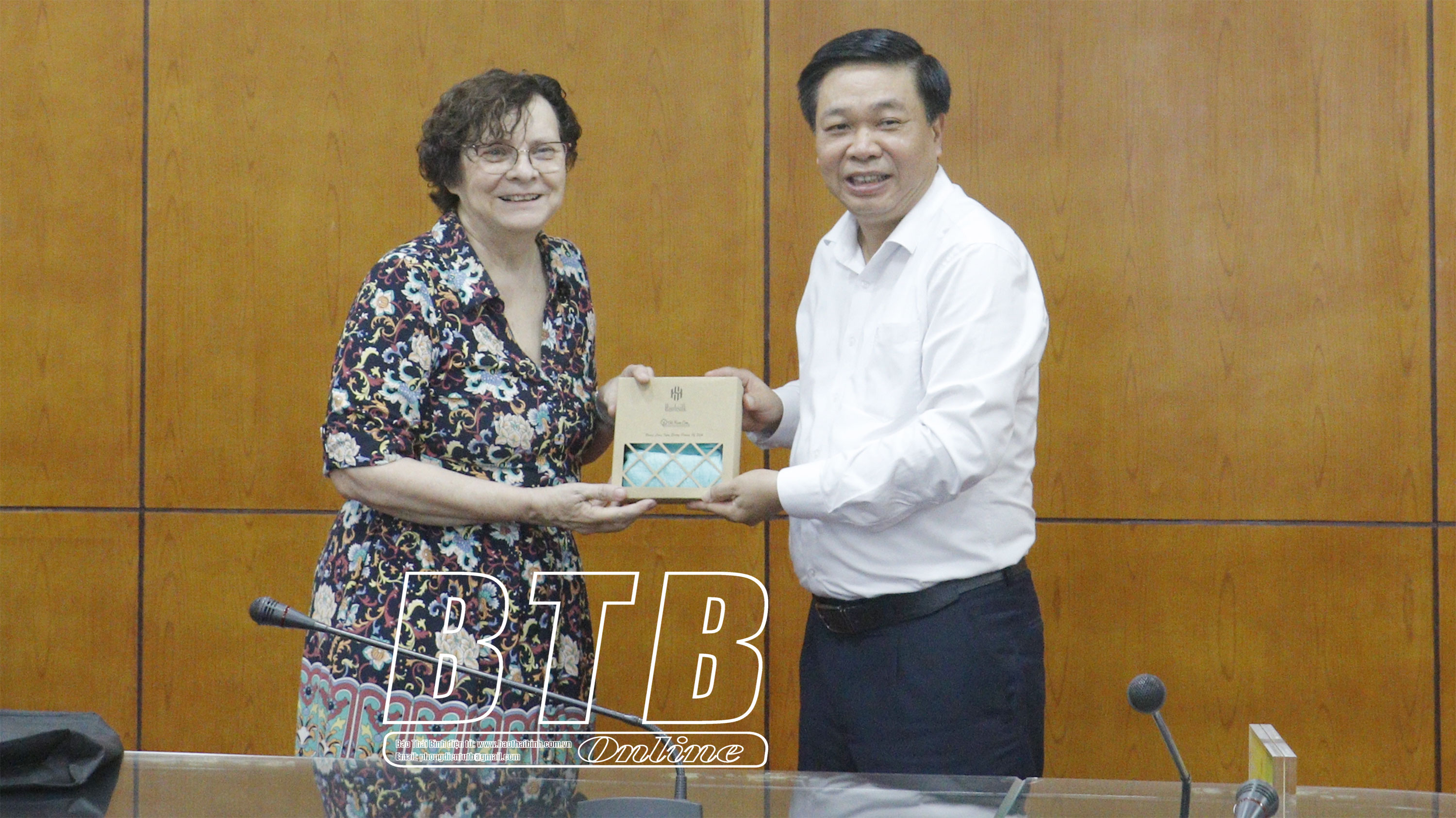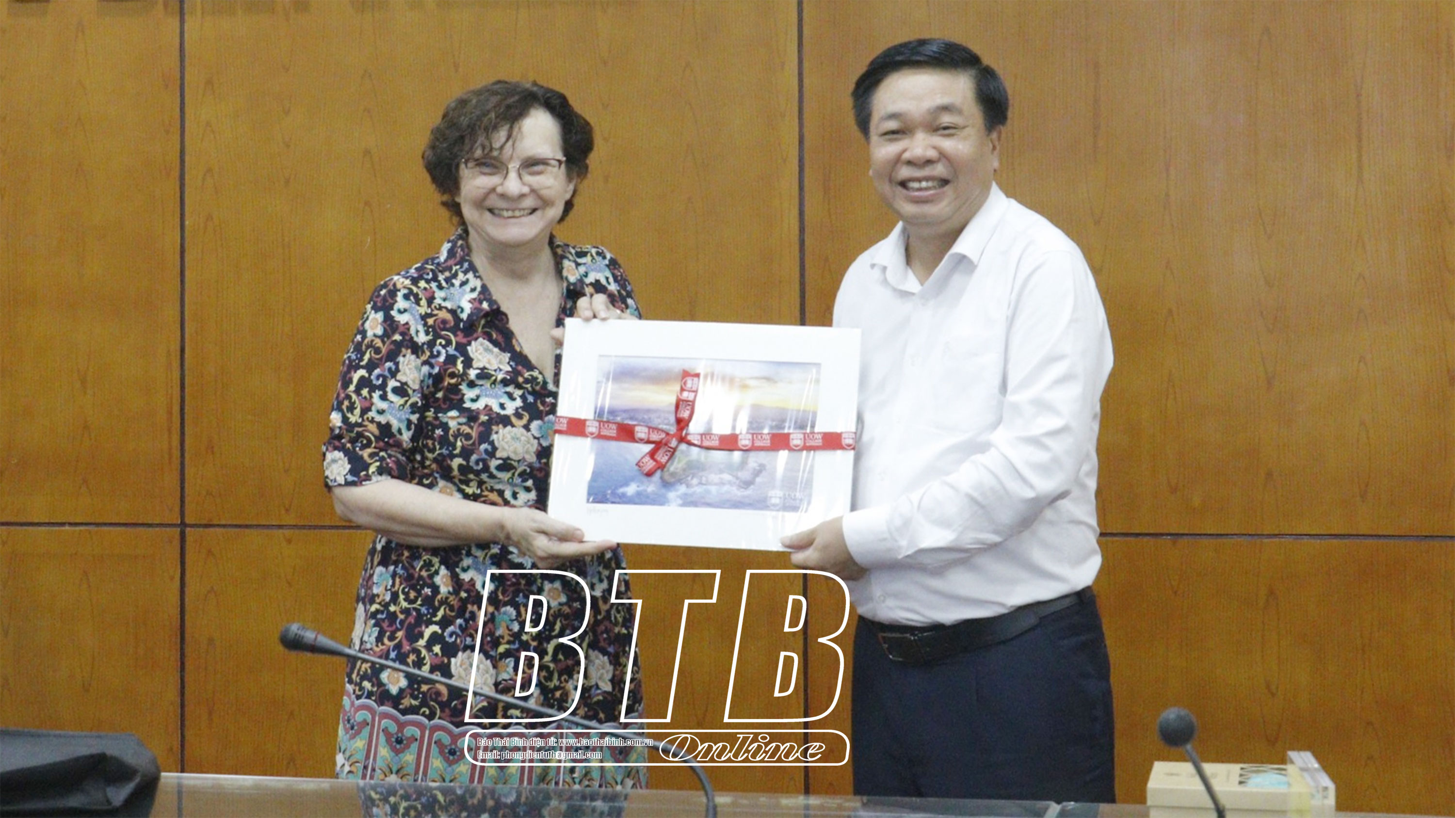 Đồng chí Nguyễn Quang Hưng, Ủy viên Ban Thường vụ Tỉnh ủy, Phó Chủ tịch thường trực UBND tỉnh tặng quà lưu niệm cho đoàn công tác của Trường Đại học Wollongong.Đoàn công tác của Trường Đại học Wollongong trao tặng quà lưu niệm cho tỉnh Thái Bình.