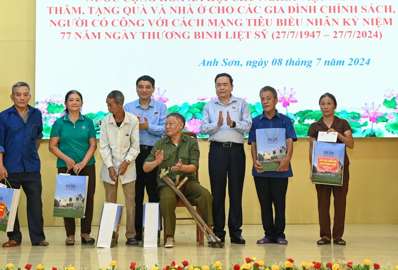 Tiếp đó, tại trụ sở Huyện ủy Anh Sơn, Chủ tịch Quốc hội Trần Thanh Mẫn và Đoàn công tác của Ủy ban Thường vụ Quốc hội đã thăm, tặng quà và chứng kiến trao tặng kinh phí hỗ trợ xây dựng 20 nhà ở cho các gia đình chính sách, người có công với cách mạng tiêu biểu.