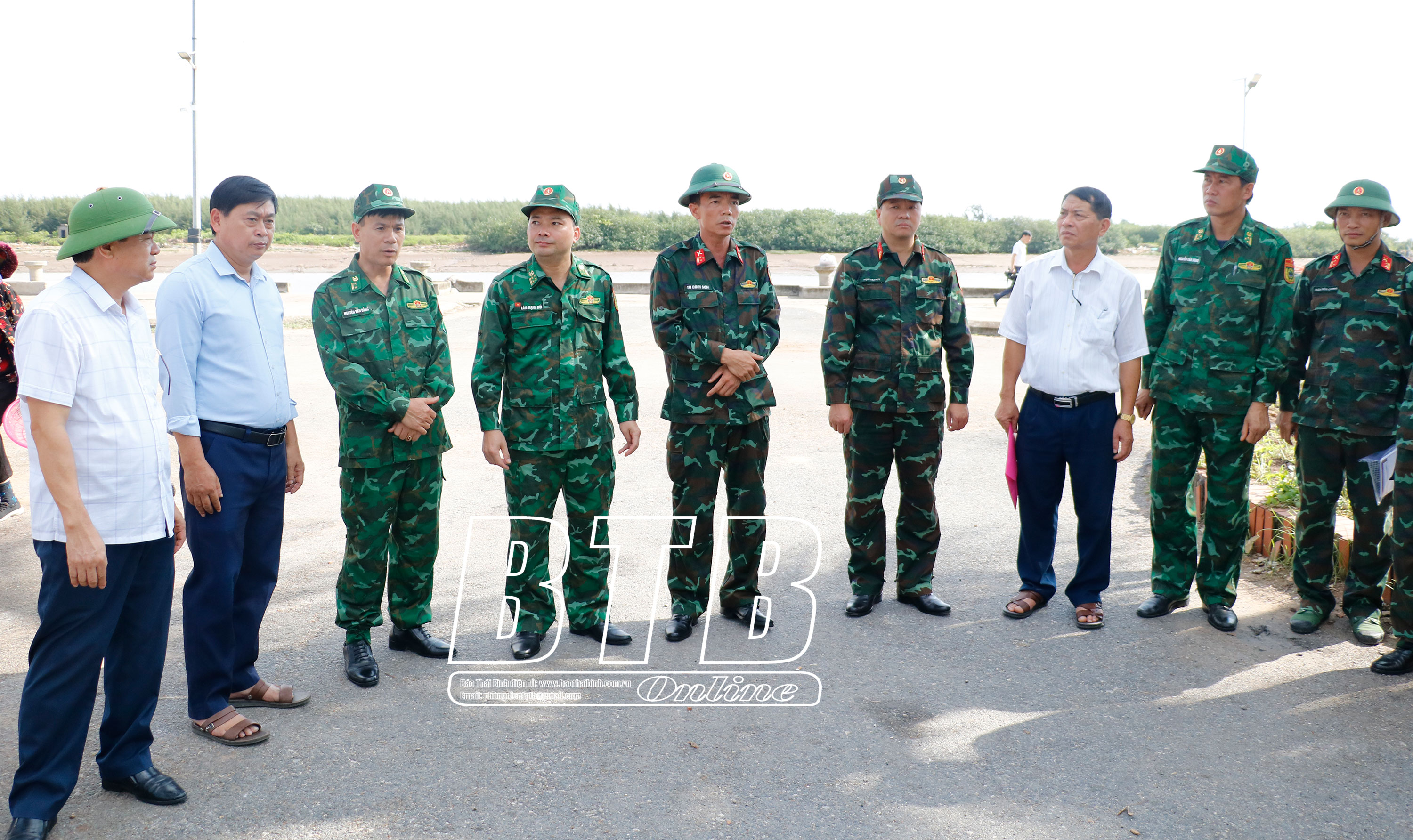 Lãnh đạo các đơn vị kiểm tra khu vực diễn ra diễn tập tại cảng cá xã Nam Thịnh (Tiền Hải).