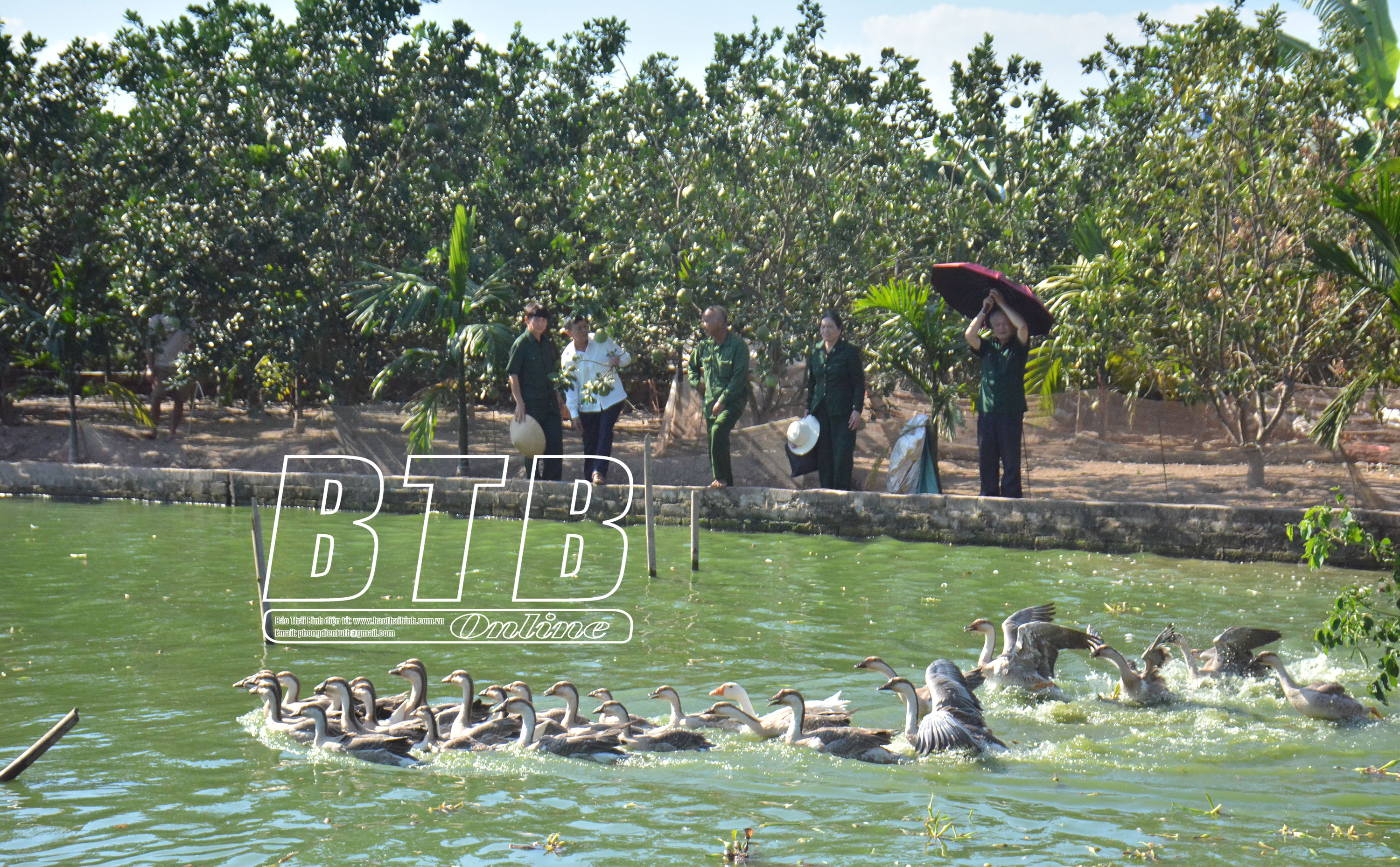 Mô hình nuôi ngỗng, cá, trồng cây ăn quả của cựu thanh niên xung phong Nguyễn Văn Cổn, thôn An Định, xã Thống Nhất (Hưng Hà).