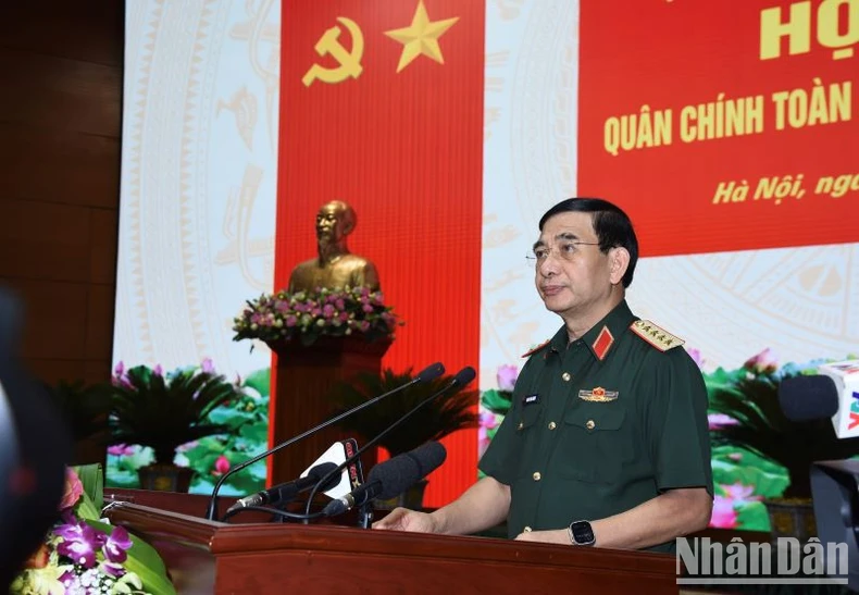 Đại tướng Phan Văn Giang, Ủy viên Bộ Chính trị, Phó Bí thư Quân ủy Trung ương, Bộ trưởng Quốc phòng phát biểu ý kiến tại Hội nghị. (Ảnh: TRẦN HẢI).