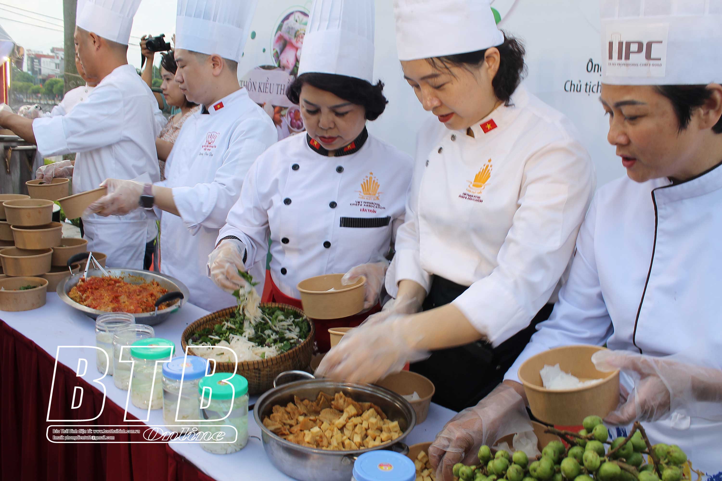 Các đầu bếp của Hội đầu bếp Hoàng Gia Việt Nam quảng diễn món bánh đa cua tù và truyền thống của người dân xã Song An (Vũ Thư).