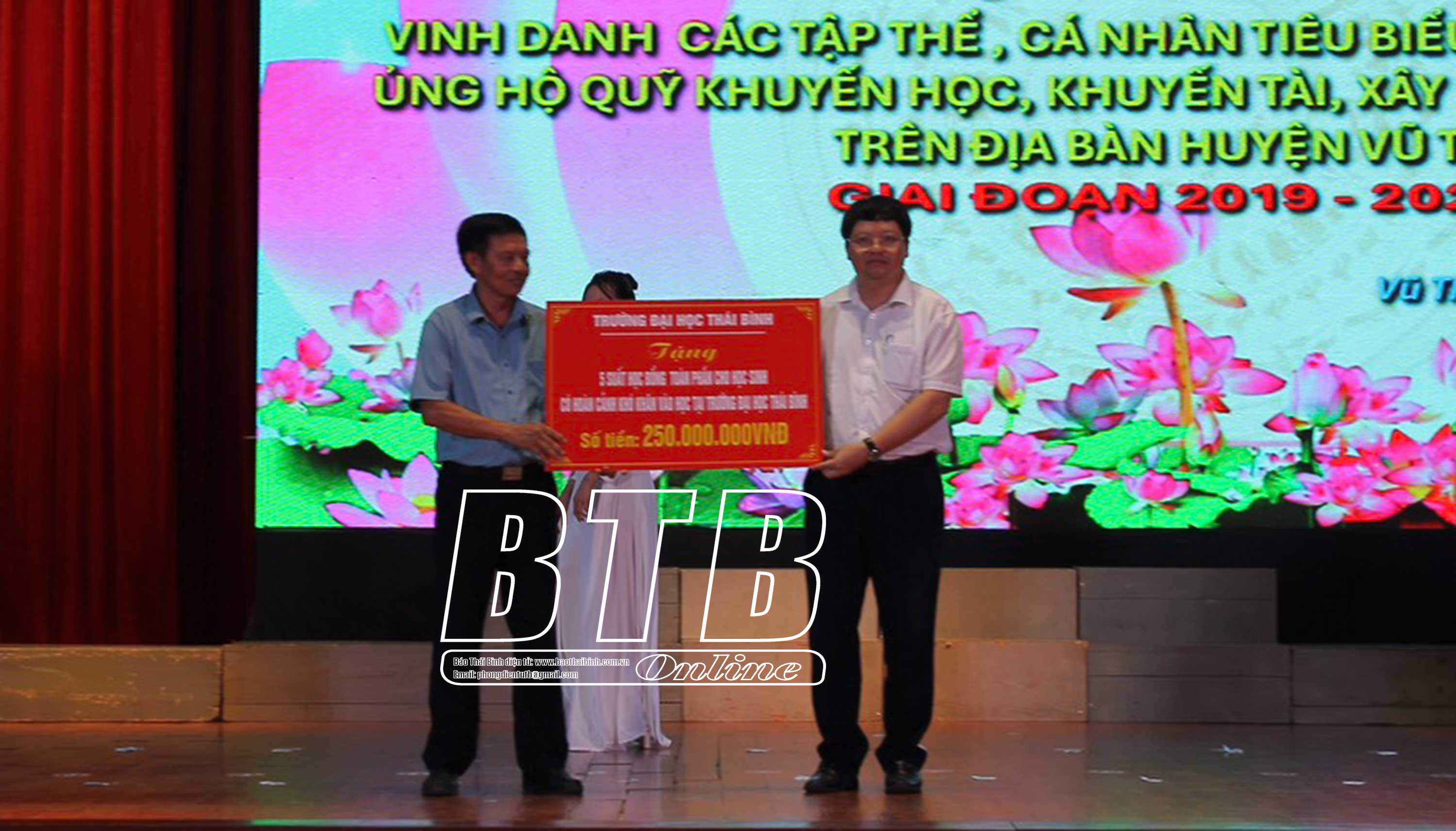 Tại hội nghị, huyện Vũ Thư đã vinh danh và trao thưởng cho 20 tập thể, 75 cá nhân tiêu biểu trong phong trào ủng hộ quỹ khuyến học, khuyến tài, xây dựng xã hội học tập giai đoạn 2019 - 2023.