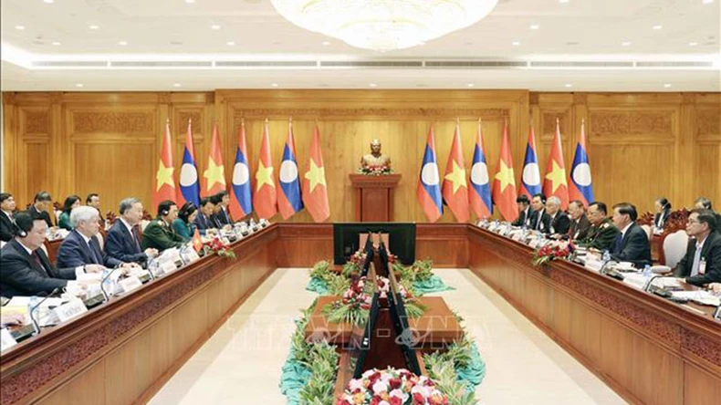 Chủ tịch nước Tô Lâm hội đàm với Tổng Bí thư, Chủ tịch nước Lào Thongloun Sisoulith. (Ảnh: NHAN SÁNG/TTXVN).