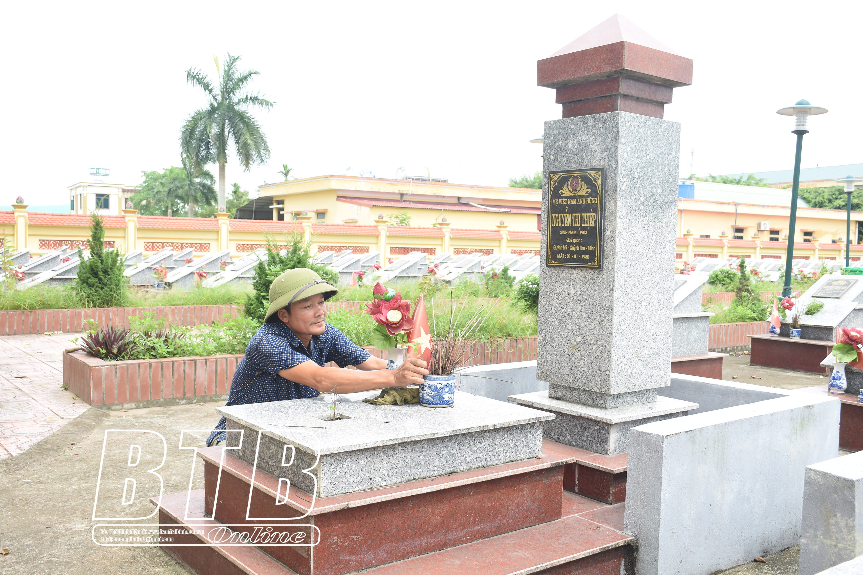 Quản trang chăm sóc phần mộ Mẹ Việt Nam anh hùng tại cụm nghĩa trang liệt sĩ xã Quỳnh Mỹ.