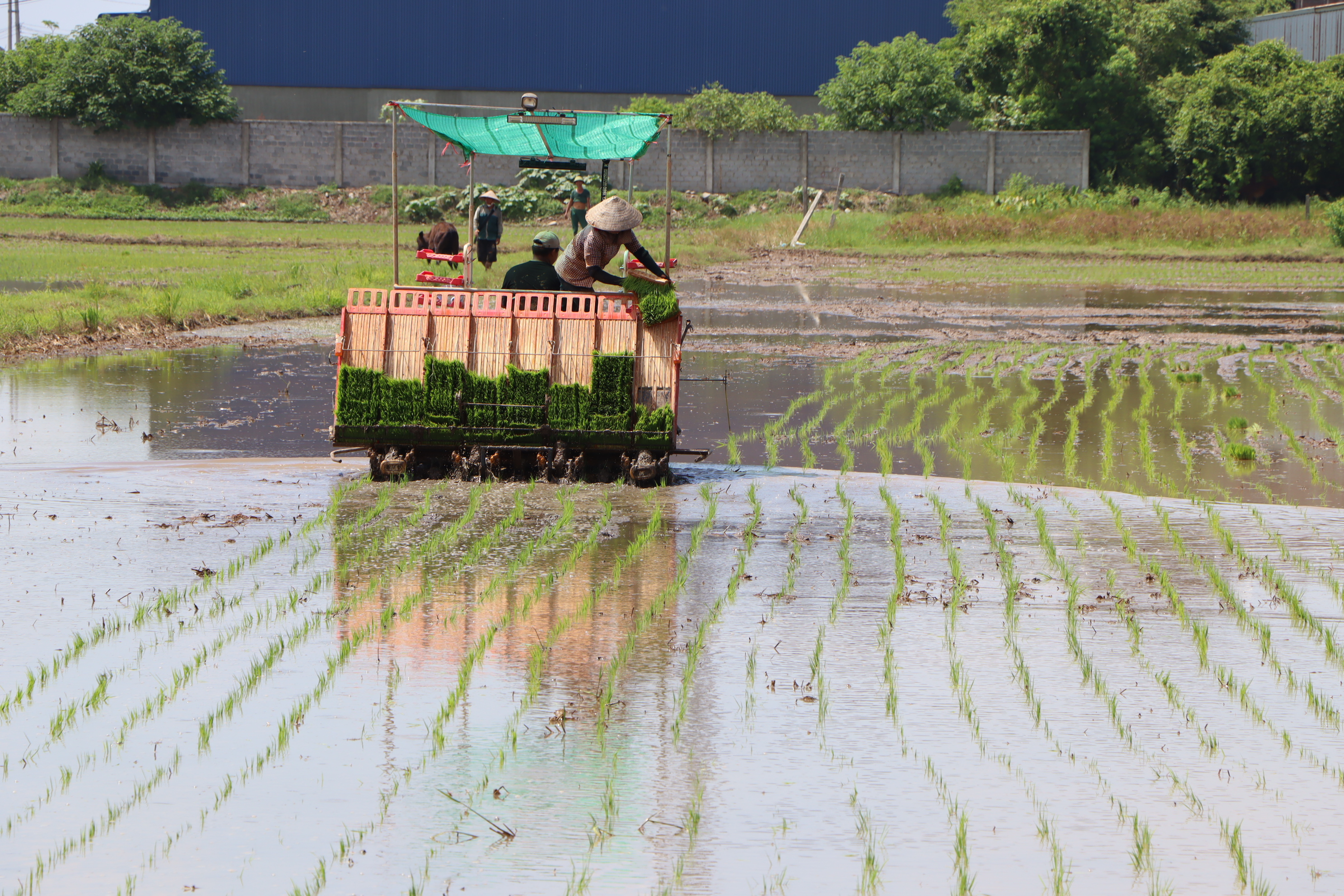 Tại cánh đồng thôn Đại Đồng, ông Vũ Đình Thoại cho biết: Năm nay là năm đầu tiên tôi đầu tư mua máy cấy to nên ngoài 20 mẫu ruộng của nhà, tôi còn cấy thuê trên 40 mẫu cho bà con. Từ ngày 7/7 tôi bắt đầu đưa máy xuống đồng, làm liên tục từ 6 giờ sáng đến 8 giờ tối. Cứ 6 người thay nhau ngồi máy, chuyển mạ bình quân mỗi ngày nhà tôi cấy được 15 mẫu. Cấy xong từ 2 - 3 ngày sẽ bón đạm, sau đó từ 7 - 10 ngày bón thúc để lúa có đà sinh trưởng, phát triển tốt.