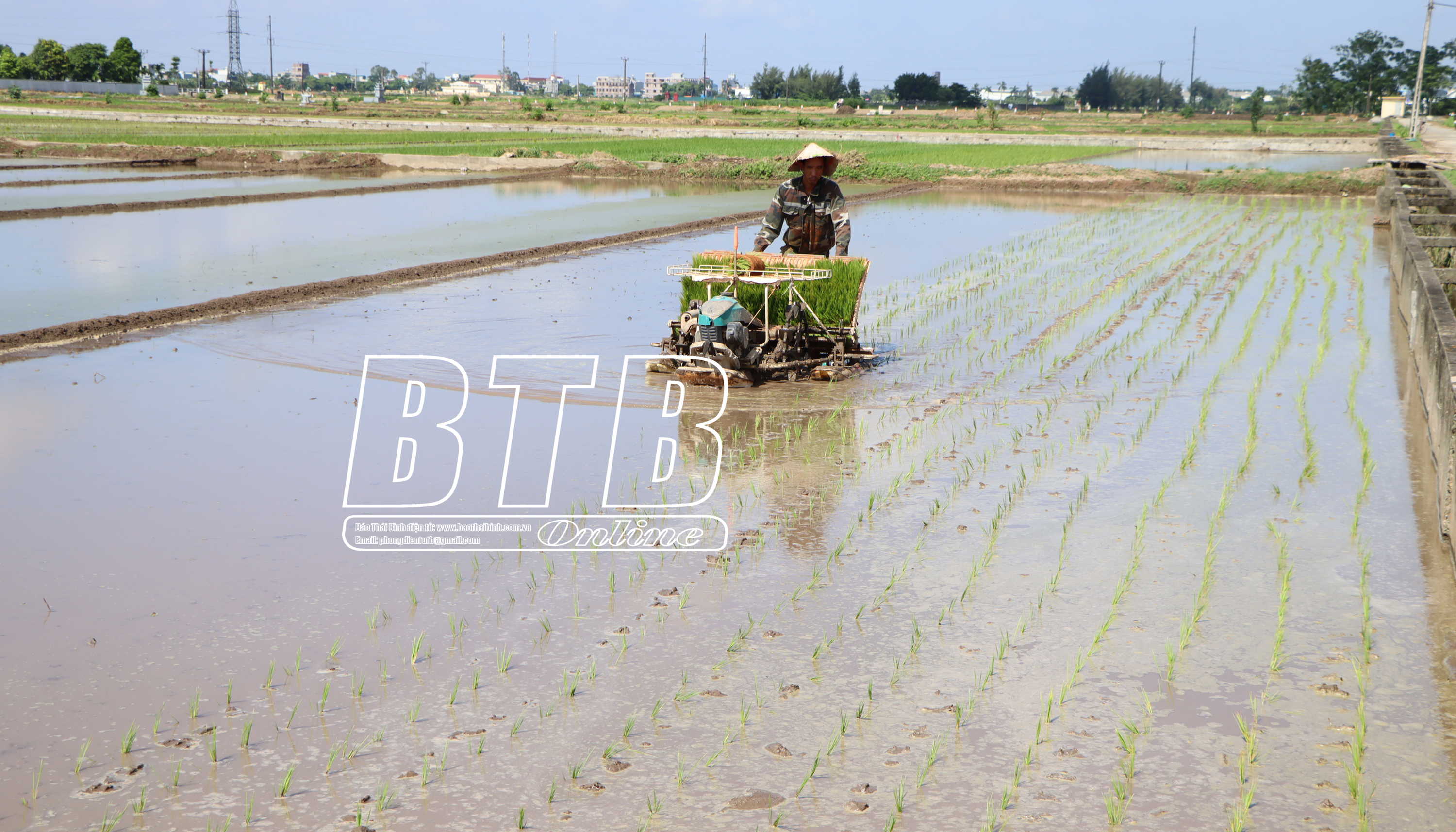 Ông Nguyễn Văn Trứ, thôn Đô Lương, xã Vũ An đưa máy cấy xuống đồng ruộng.