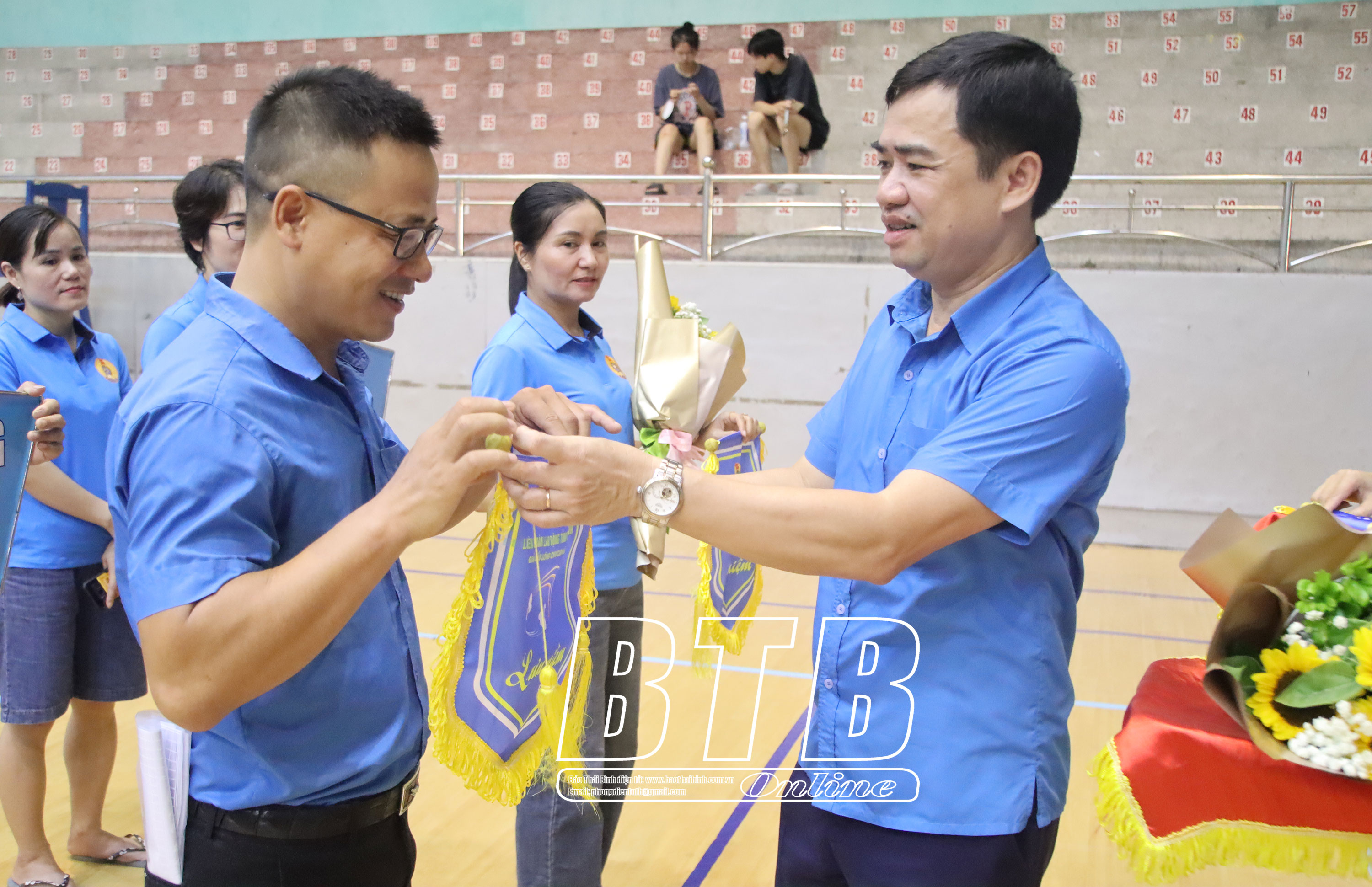 Lãnh đạo Liên đoàn Lao động tỉnh tặng hoa, cờ lưu niệm cho các đội tham gia giải.