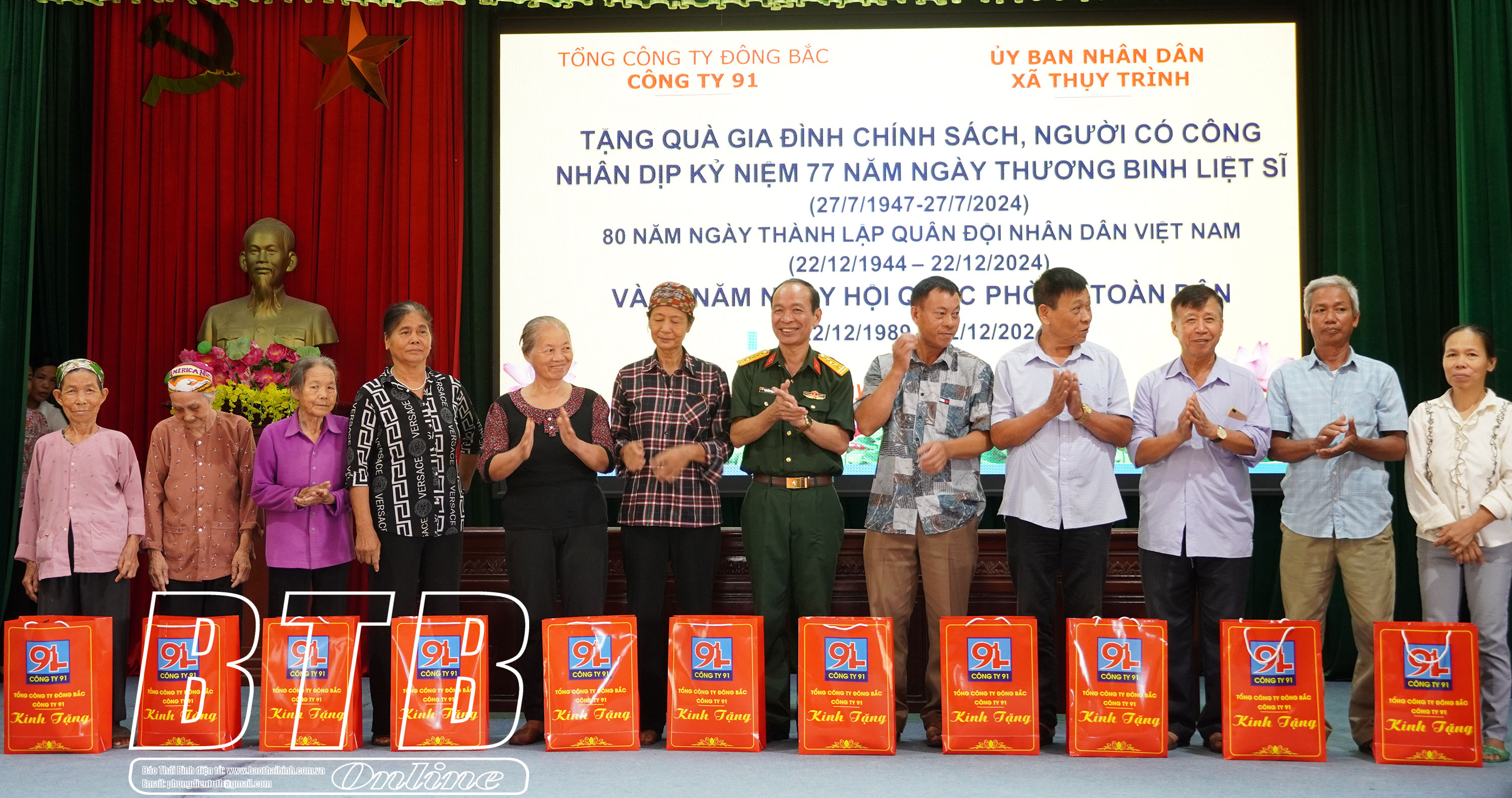 Cũng trong dịp này, Công ty 91- Tổng Công ty Đông Bắc trao tặng 30 suất quà cho gia đình chính sách, người có công với cách mạng ở xã Thụy Trình; bàn giao 50 bộ máy tính cho Trường THPT Đông Thụy Anh với tổng trị giá trên 600 triệu đồng.