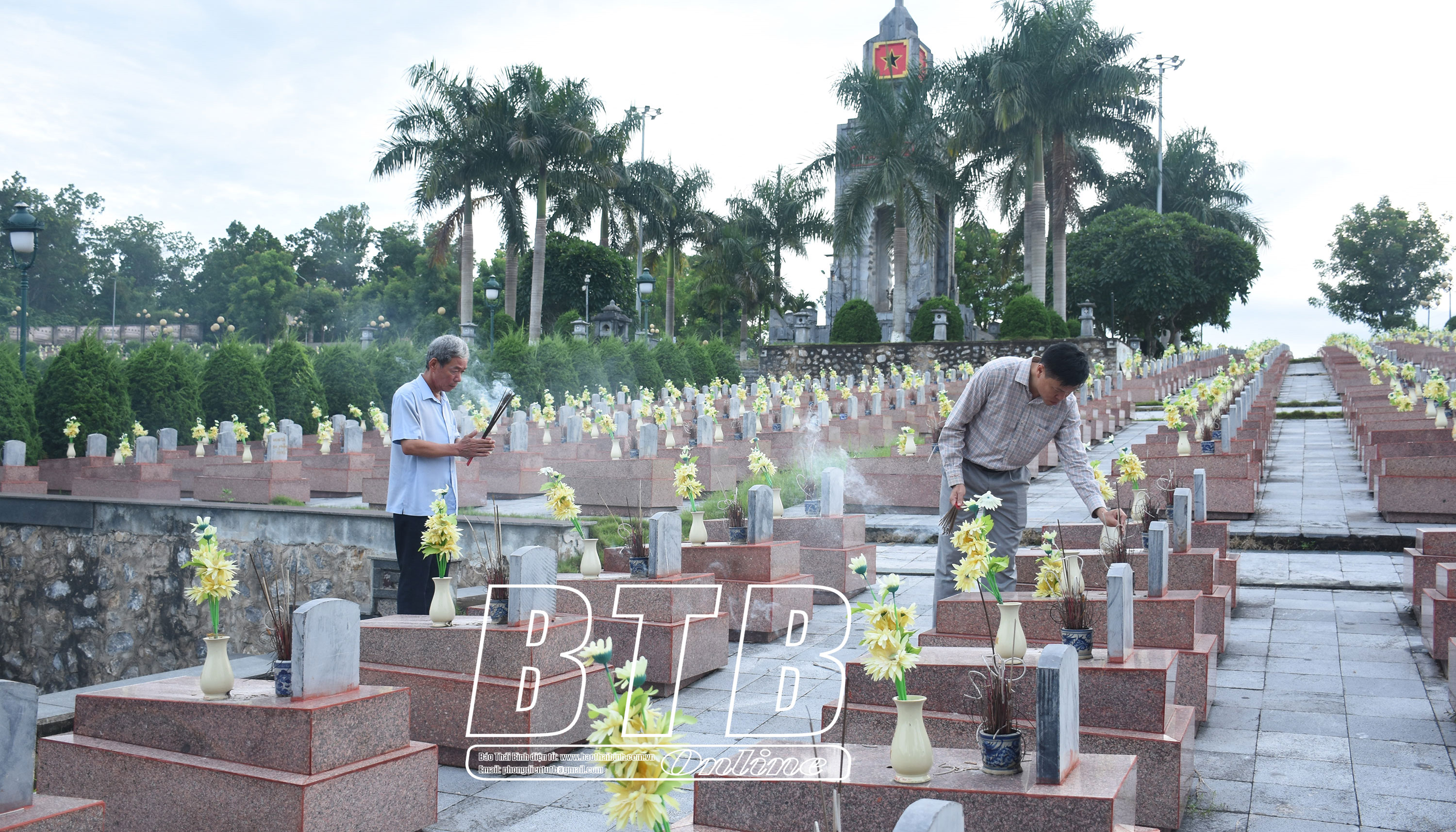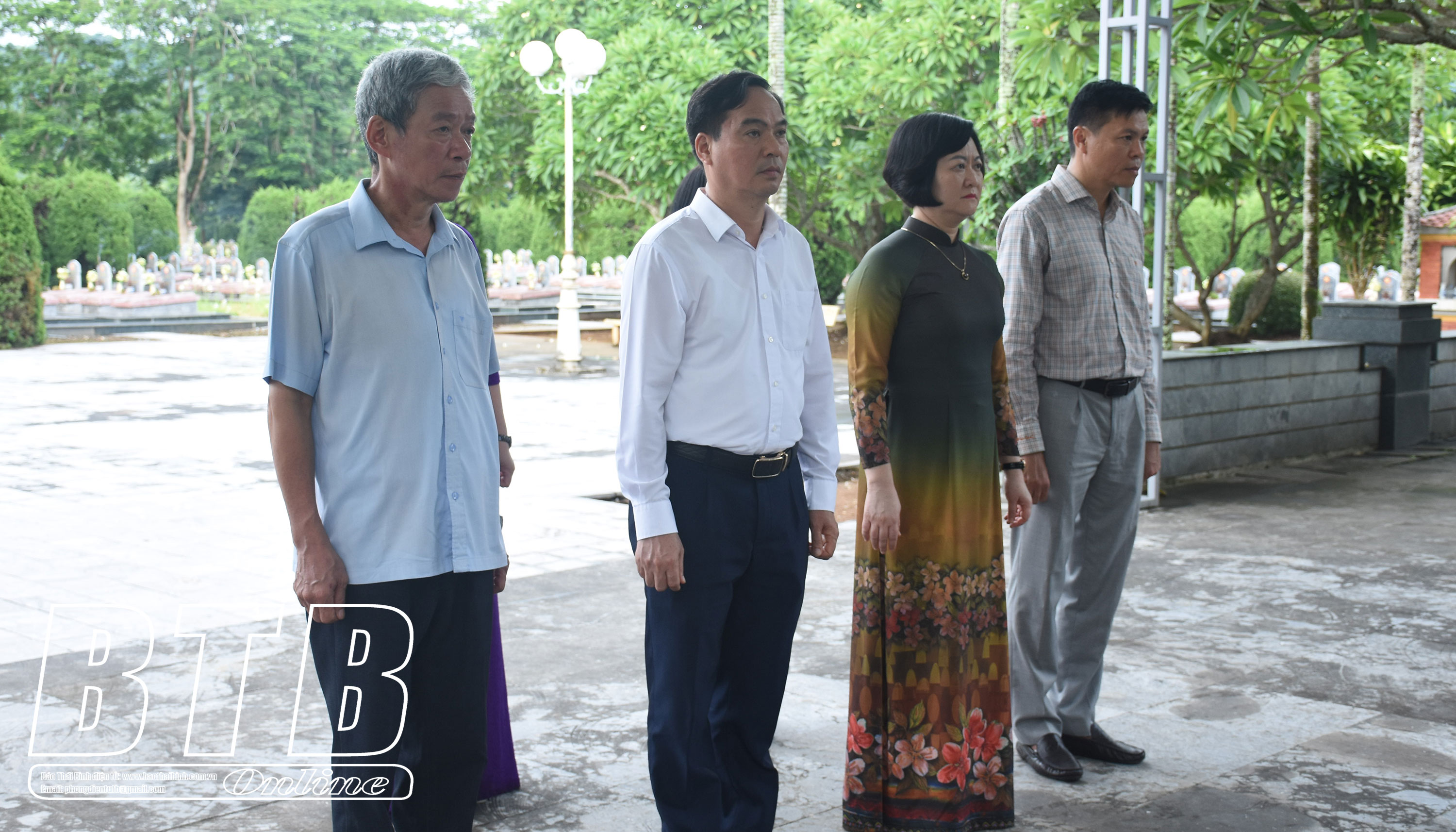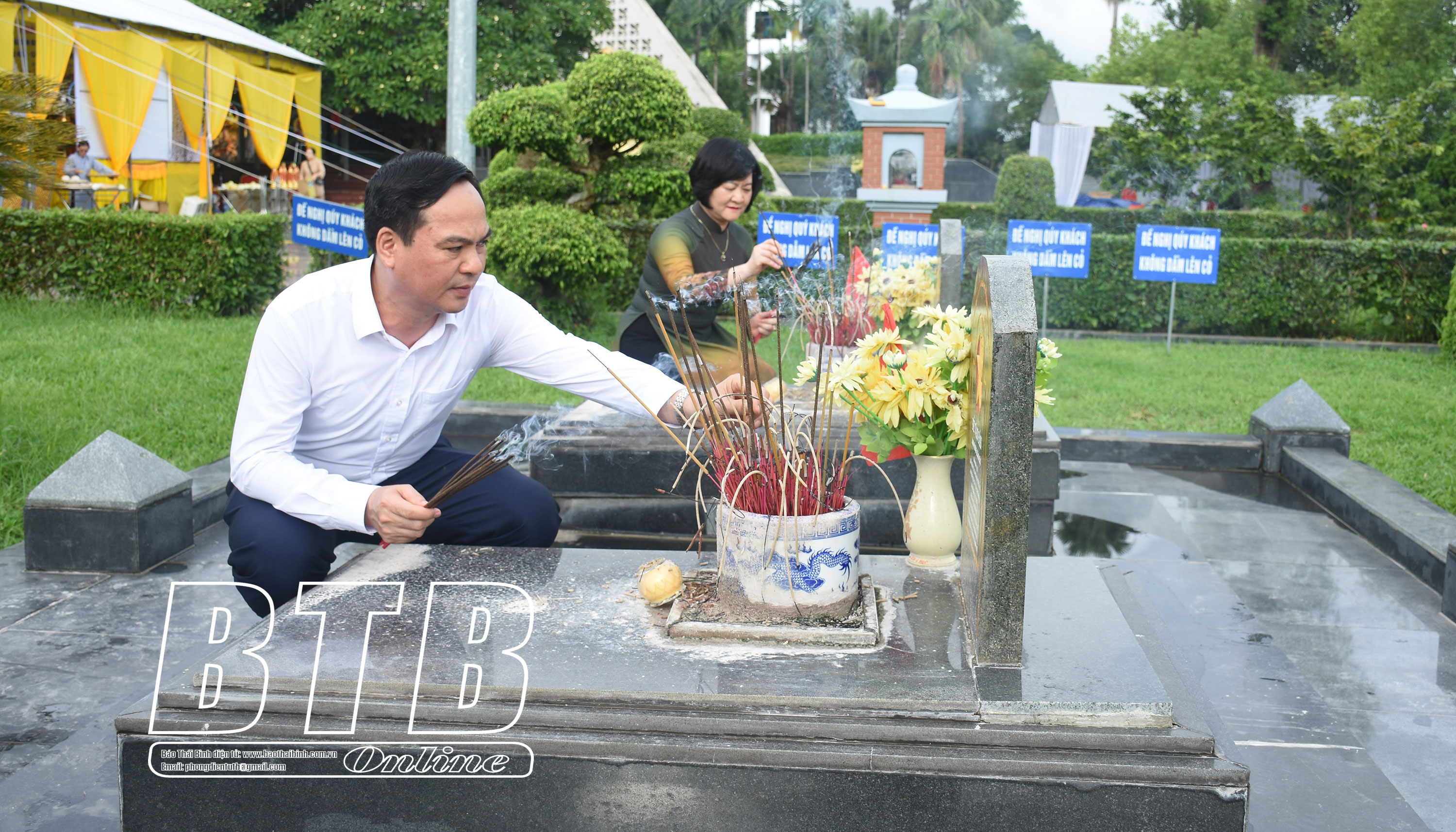 Trong không khí trang nghiêm, thành kính, đoàn đại biểu tỉnh Thái Bình đã đặt vòng hoa, dâng hương, dành phút mặc niệm tưởng nhớ công ơn các anh hùng liệt sĩ và thắp hương từng phần mộ liệt sĩ.