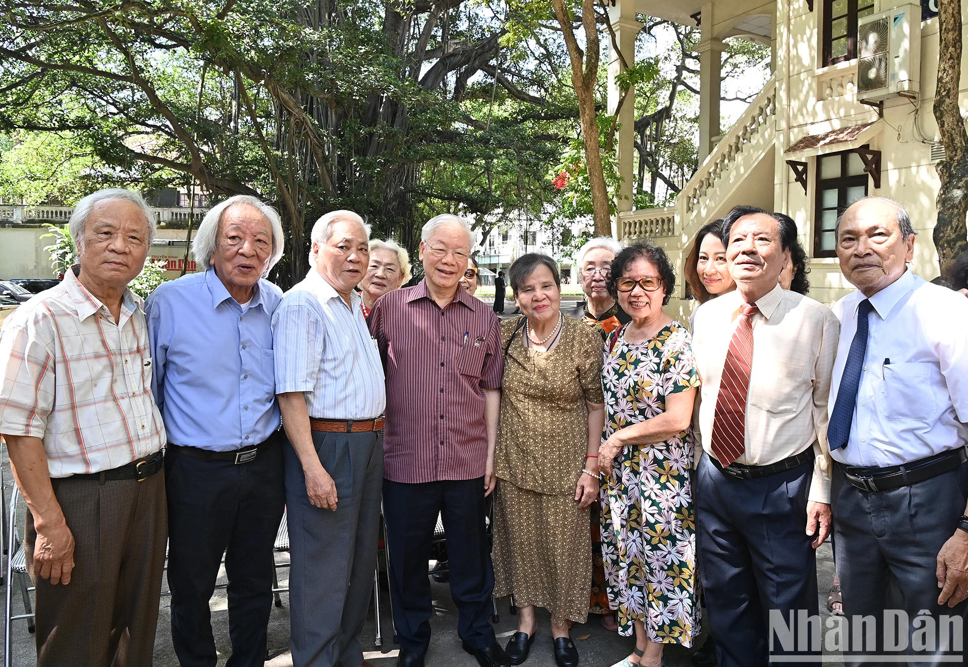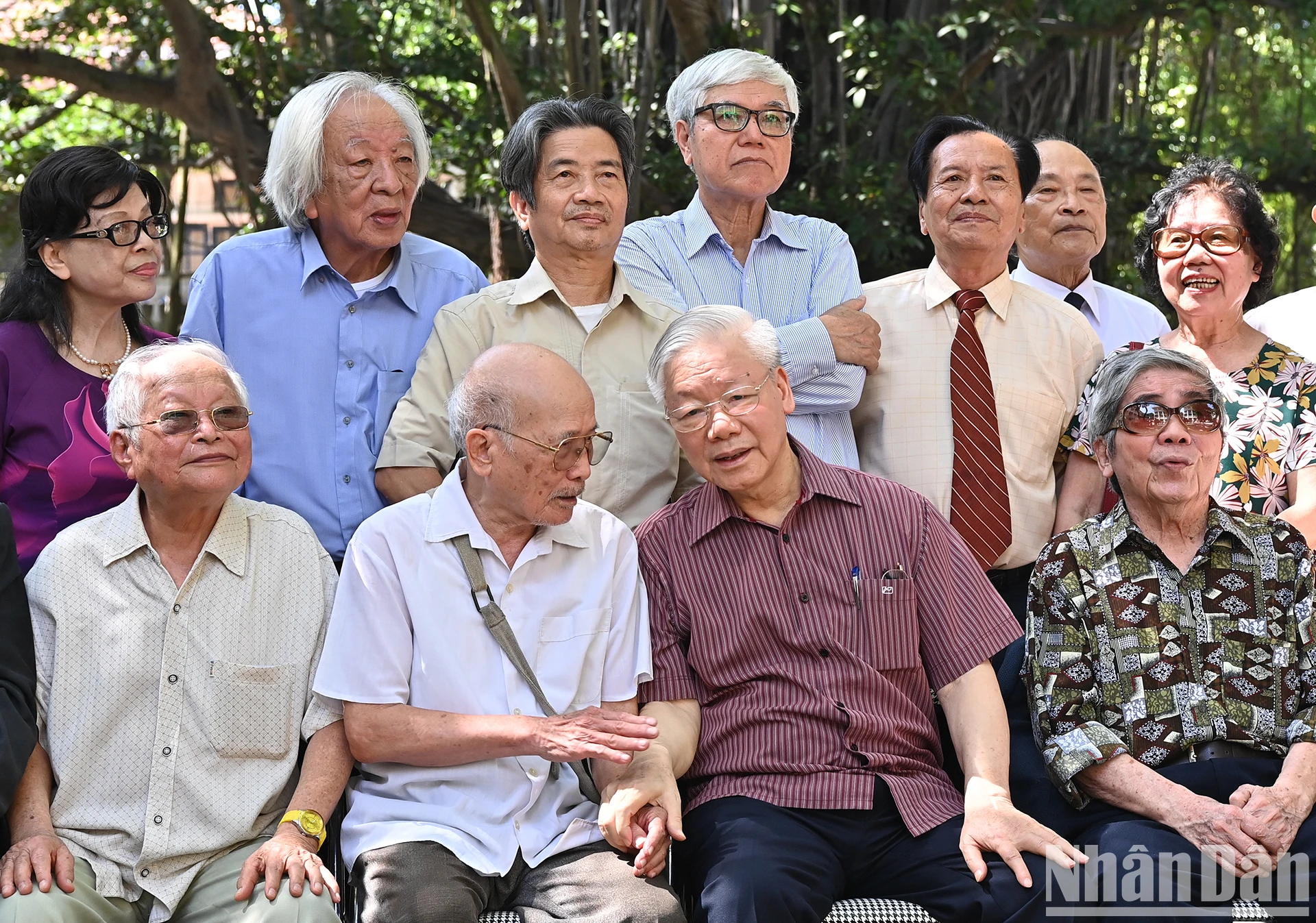 Tổng Bí thư Nguyễn Phú Trọng cùng các thầy cô và bạn bè lớp Văn khóa VIII chụp ảnh lưu niệm trong khuôn viên Báo Nhân Dân.