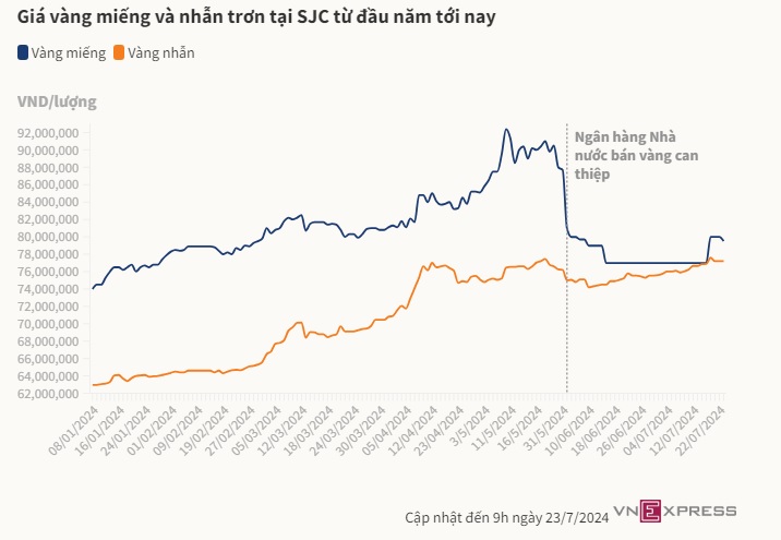 Sáng 23/7, Công ty Vàng bạc đá quý Sài Gòn (SJC) và 4 nhà băng quốc doanh niêm yết giá mua bán vàng miếng tại 77,5 - 79,5 triệu đồng, giảm 500.000 đồng mỗi lượng so với hôm qua. Vàng miếng tại các thương hiệu được phép kinh doanh vàng miếng khác như DOJI, PNJ... sáng nay cũng "đồng giá" về mức 77,5 - 79,5 triệu đồng.