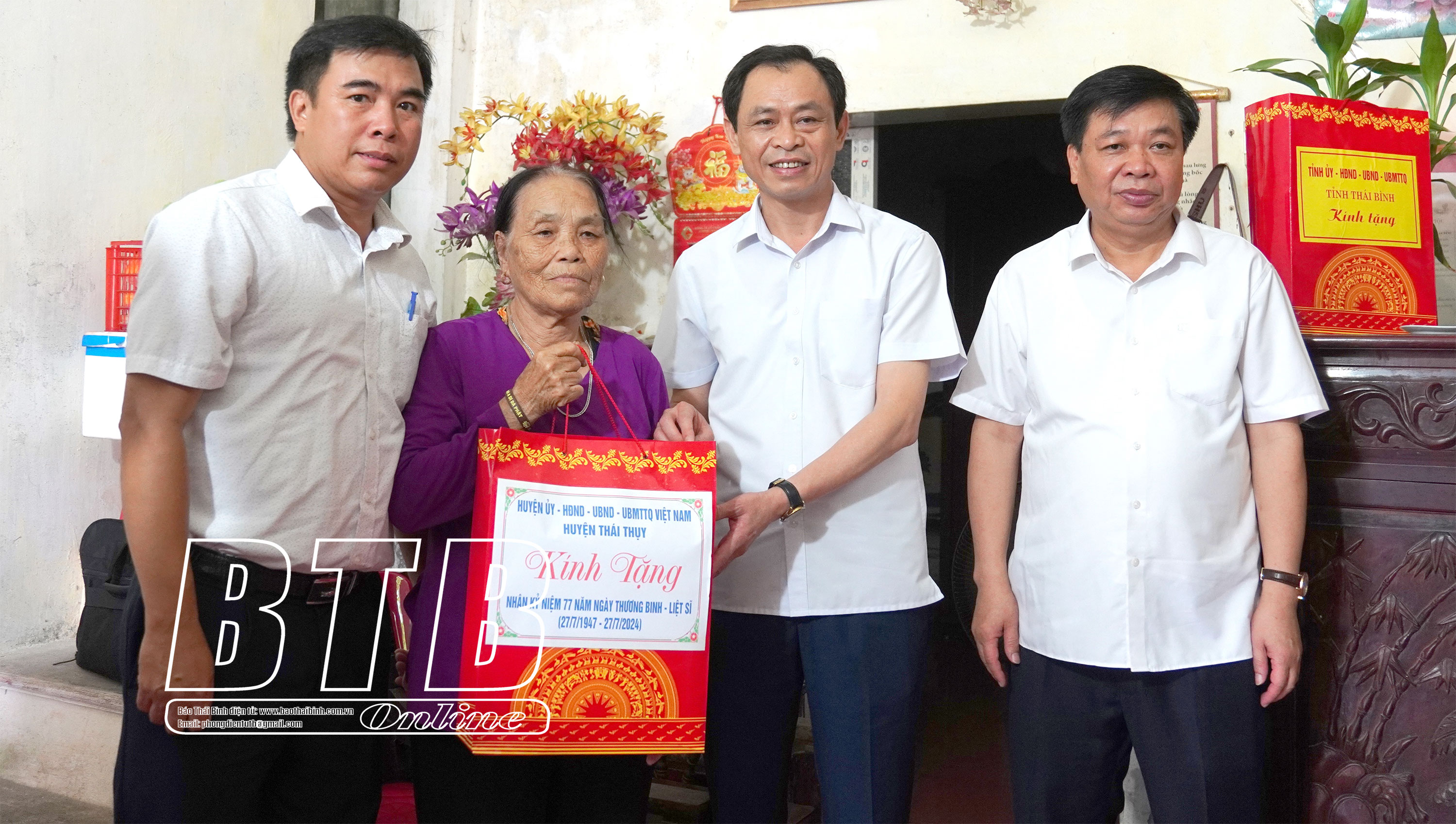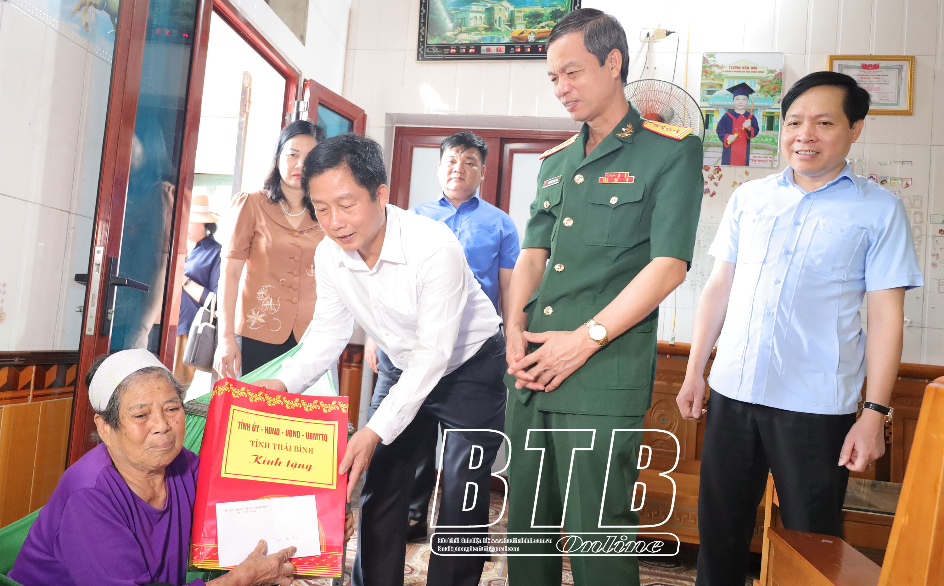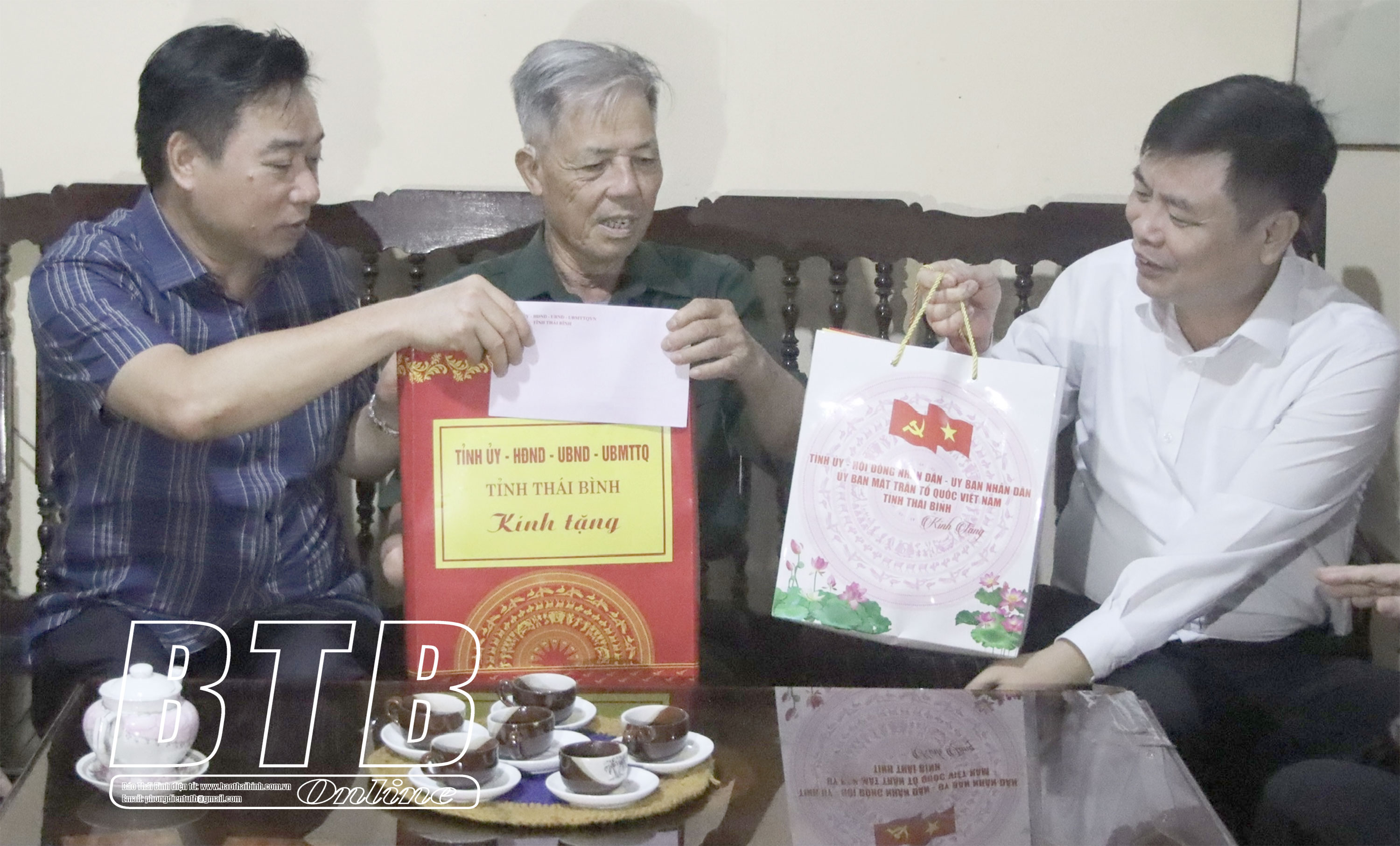 Các đồng chí: Nguyễn Quang Hưng, Ủy viên Ban Thường vụ Tỉnh ủy, Phó Chủ tịch thường trực UBND tỉnh; Vũ Kim Cứ, Ủy viên Ban Thường vụ Tỉnh ủy, Trưởng ban quản lý Khu kinh tế và các khu công nghiệp tỉnh; Vũ Ngọc Trì, Tỉnh ủy viên, Phó Chủ tịch HĐND tỉnh; lãnh đạo Hội Cựu chiến binh tỉnh, huyện Thái Thụy đã tới thăm, tặng quà gia đình chính sách, người có công trên địa bàn huyện Thái Thụy.