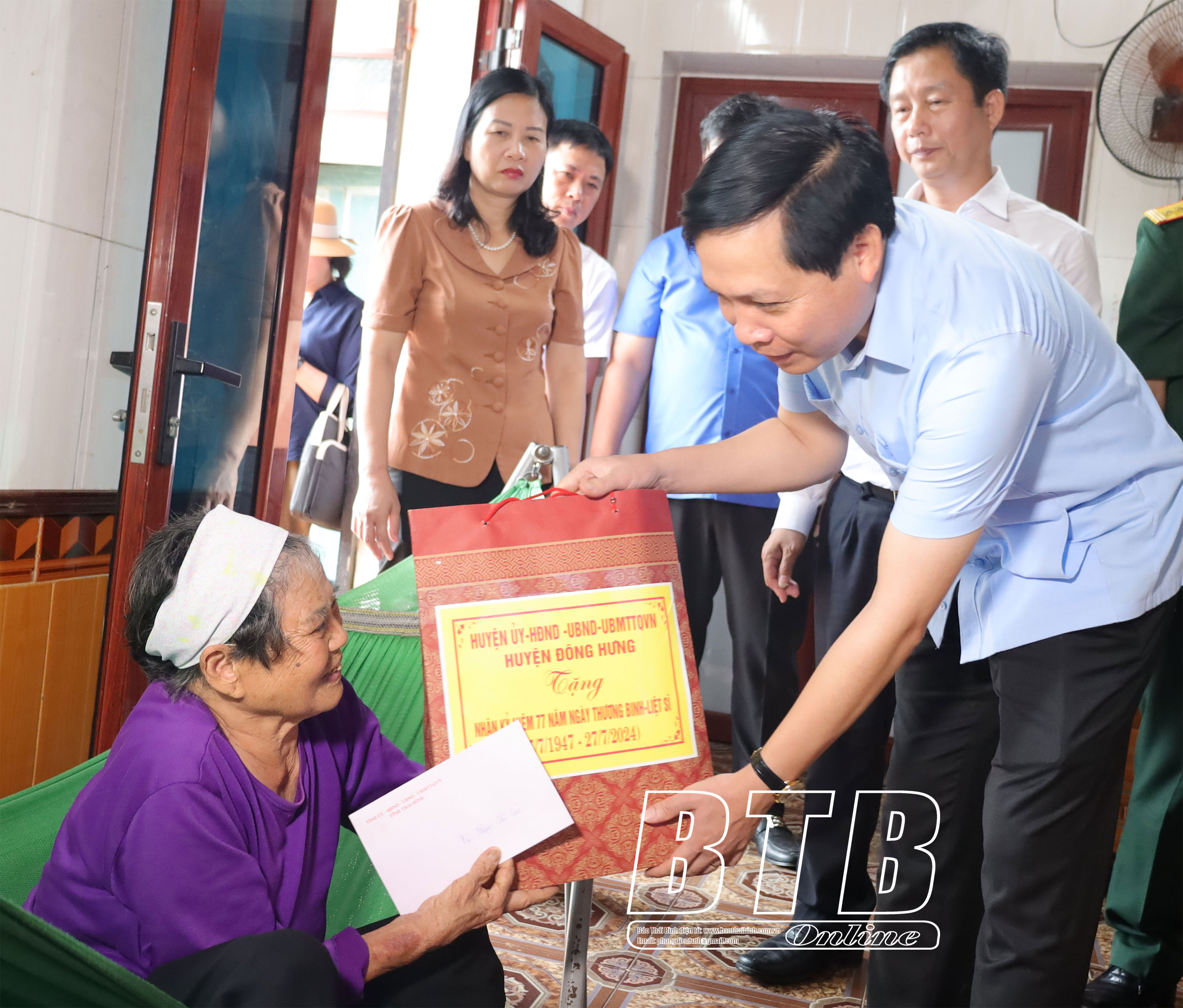 Sáng ngày 24/7, đồng chí Vũ Thanh Vân, Ủy viên Ban Thường vụ Tỉnh ủy, Chủ tịch Ủy ban MTTQ tỉnh; Đại tá Nguyễn Ngọc Tuệ, Ủy viên Ban Thường vụ Tỉnh ủy, Chỉ huy trưởng Bộ Chỉ huy Quân sự tỉnh cùng lãnh đạo Hội Liên hiệp Phụ nữ tỉnh, lãnh đạo huyện Đông Hưng đã đến thăm, tặng quà bà Phạm Thị Cúc là vợ liệt sĩ và thương binh Phạm Văn Duyệt, xã Đông Phương (Đông Hưng).
