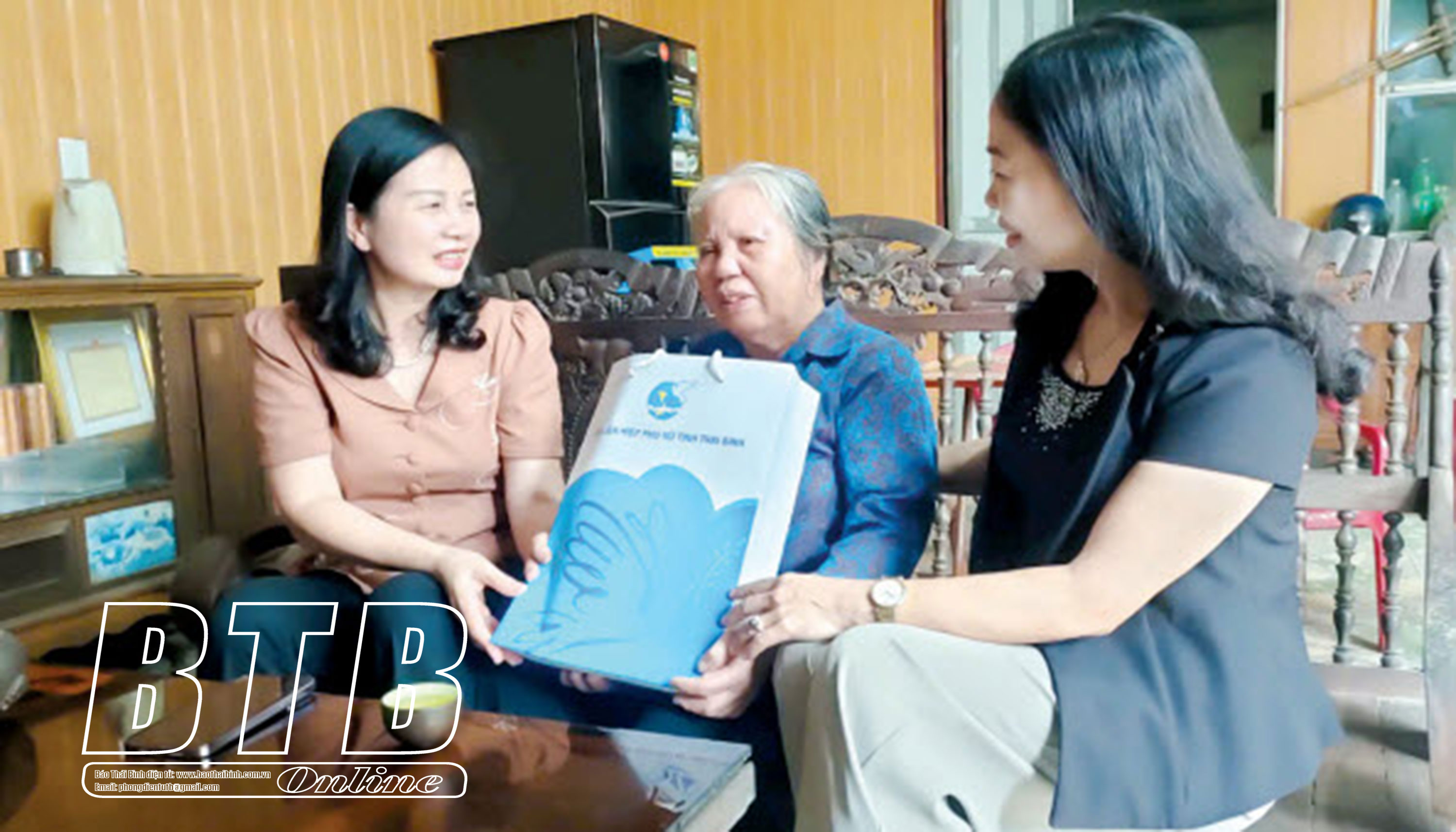 Lãnh đạo Hội Liên hiệp Phụ nữ tỉnh tặng quà bà Phạm Thị Lan, vợ liệt sĩ ở thôn Phú Điền, xã Đông Động (Đông Hưng).