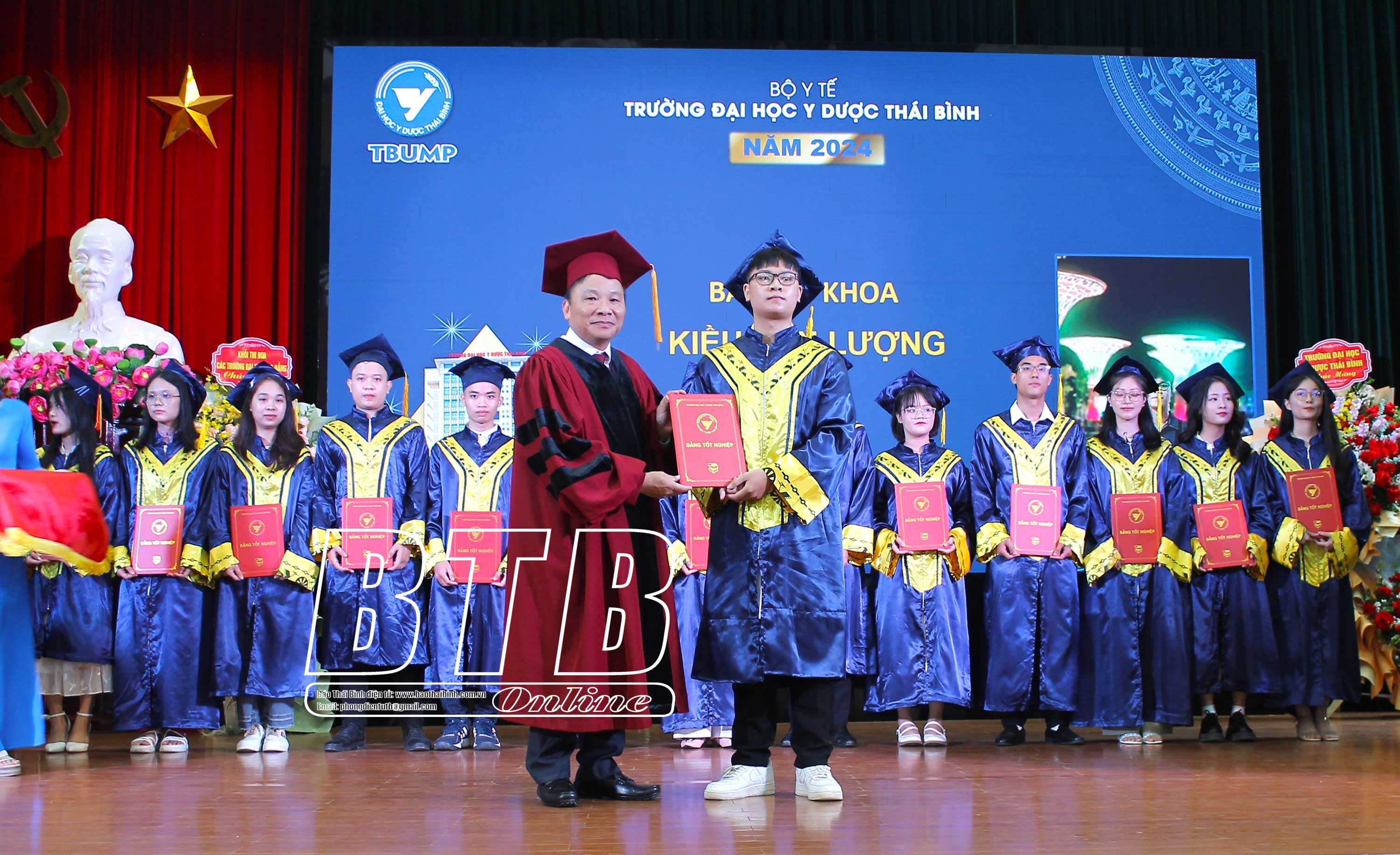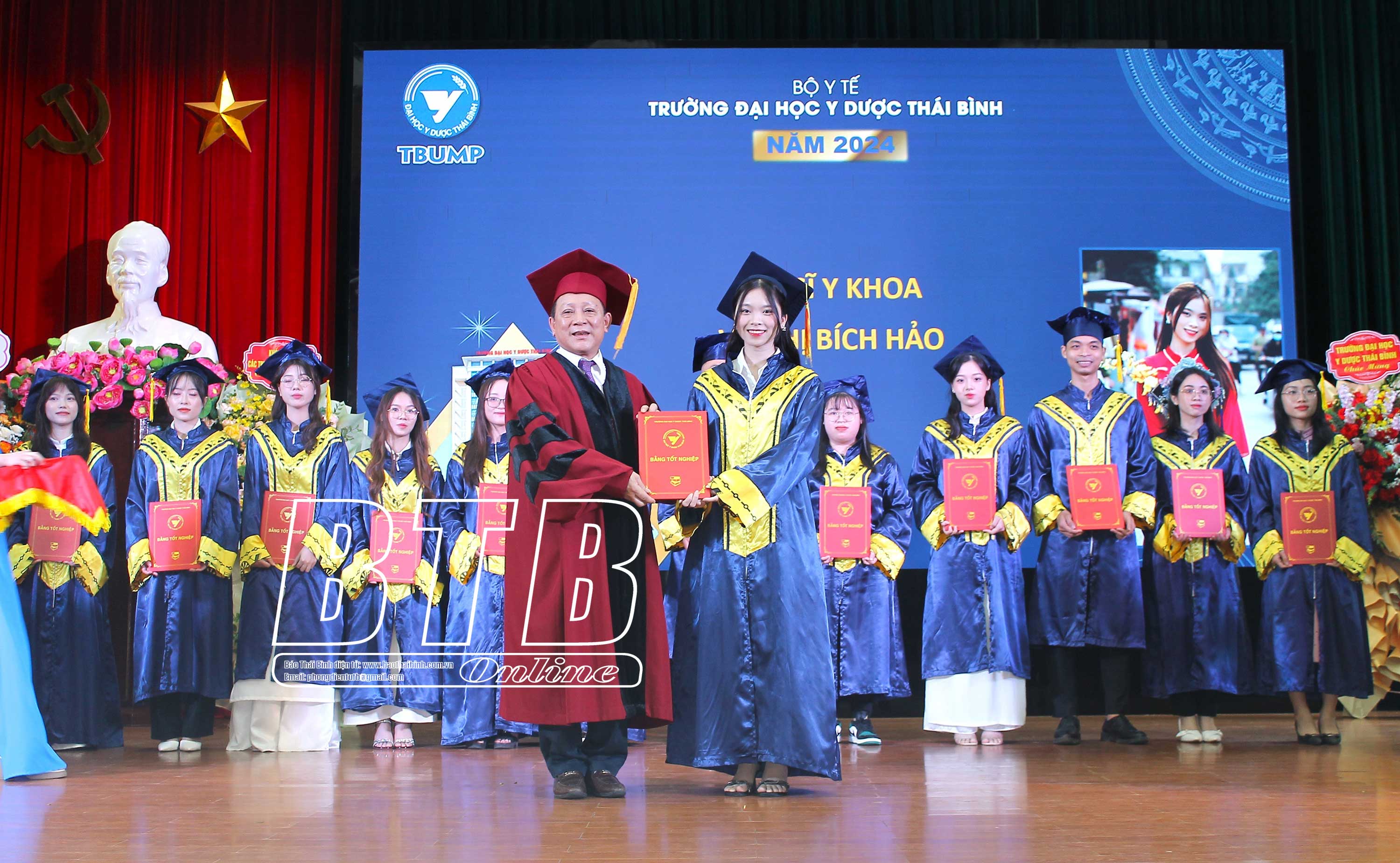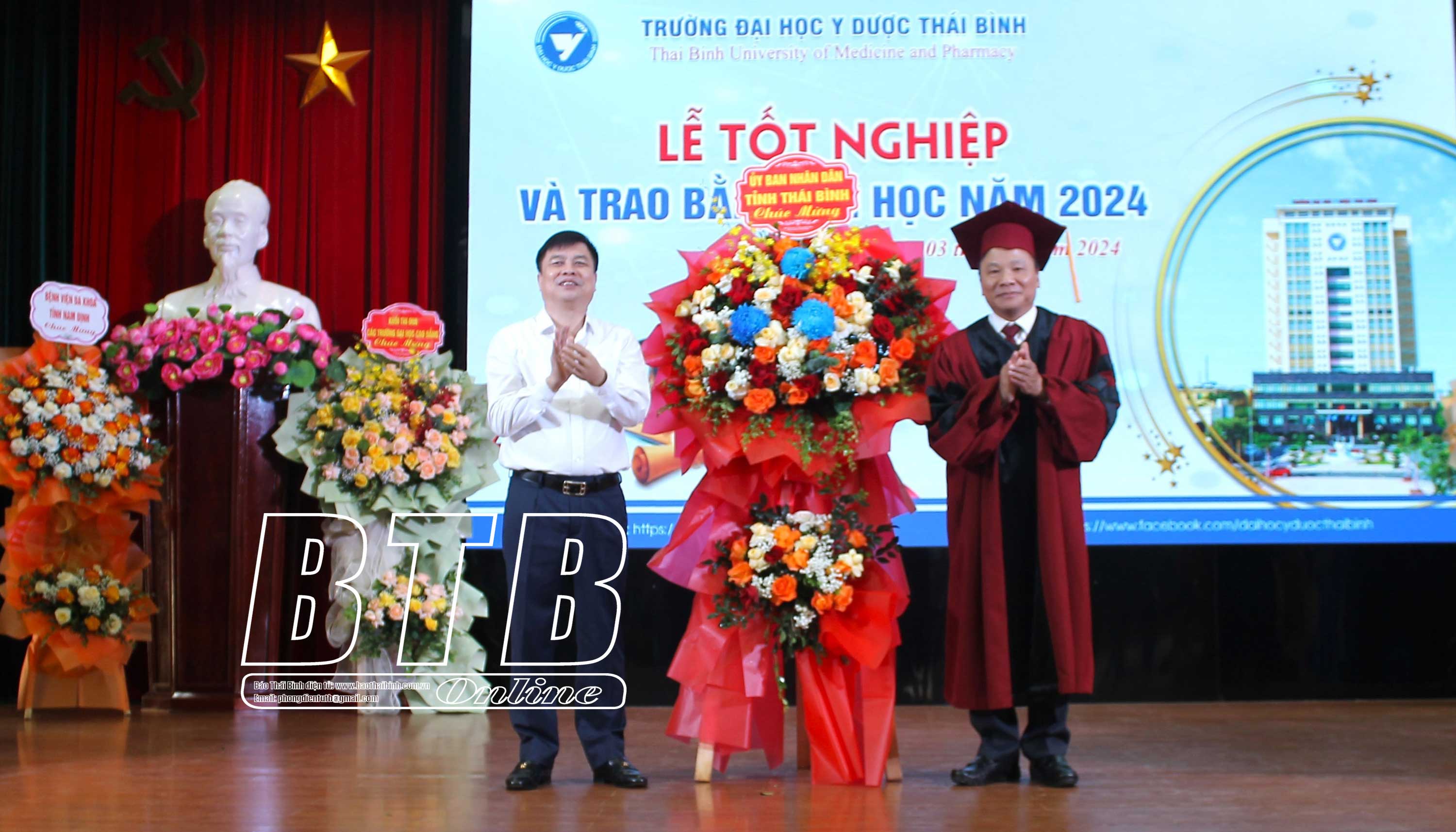 Đồng chí Bí thư Đảng ủy, Chủ tịch Hội đồng Trường Đại học Y Dược Thái Bình trao bằng tốt nghiệp cho các tân bác sĩ, tân cử nhân năm 2024.