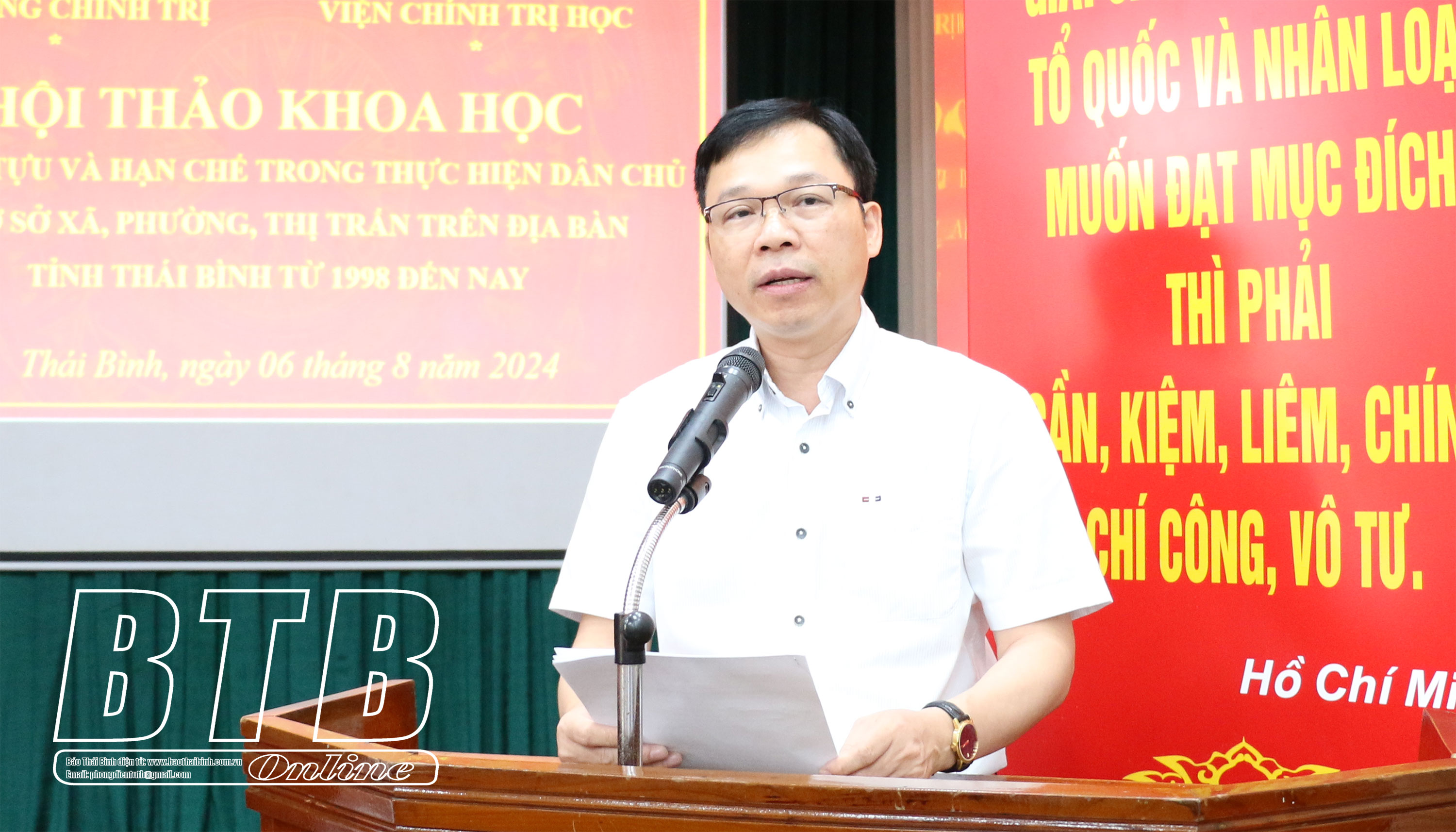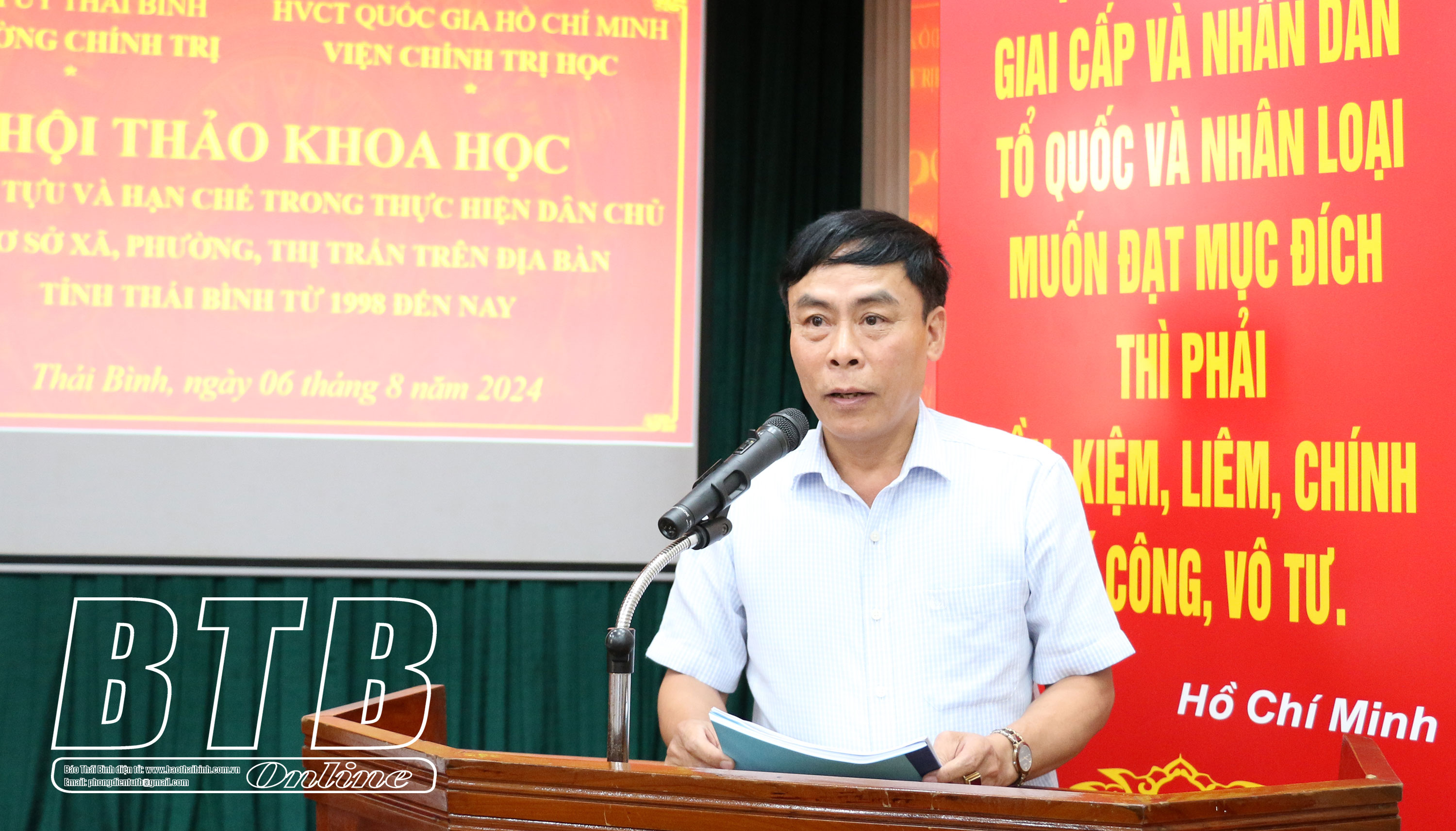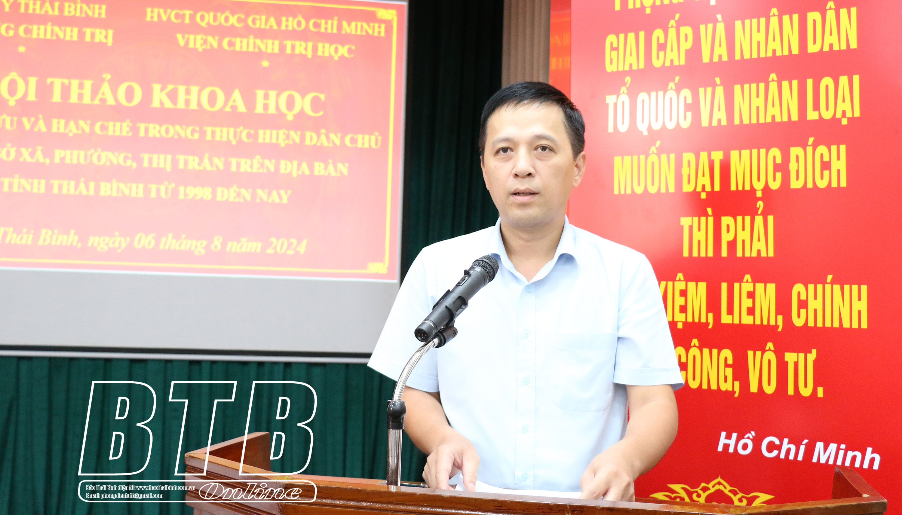 Phát biểu đề dẫn tại hội thảo, PGS.TS Lưu Văn Quảng, Viện trưởng Viện Chính trị học, Học viện Chính trị quốc gia Hồ Chí Minh nhấn mạnh: Thái Bình là một tỉnh điển hình ở khu vực đồng bằng Bắc Bộ trên nhiều phương diện về vị trí địa lý, lịch sử, văn hóa truyền thống, tiềm năng phát triển kinh tế… Đồng thời, Thái Bình cũng là nơi gắn với nguồn gốc phát sinh những quy định, thể chế về thực hiện dân chủ ở cơ sở. Cho đến nay, việc thực hiện dân chủ ở cơ sở tại Thái Bình đã có những chuyển biến mạnh mẽ theo chiều hướng tích cực, đặc biệt có nhiều kinh nghiệm hay, cách làm sáng tạo, qua đó tạo động lực mạnh mẽ cho sự phát triển bứt phá của tỉnh trong những năm qua. Việc tổ chức hội thảo nhằm tạo diễn đàn để các nhà nghiên cứu và các nhà hoạt động chính trị thực tiễn cùng trao đổi, chia sẻ về những vấn đề, thành tựu và hạn chế, thuận lợi và khó khăn, đề xuất giải pháp để giải quyết các vấn đề phát sinh trong quá trình triển khai tổ chức thực hiện dân chủ ở xã, phường, thị trấn trên địa bàn tỉnh Thái Bình. Ban Tổ chức hội thảo sẽ chắt lọc những thông tin, kinh nghiệm quý báu từ các bài tham luận, ý kiến phát biểu của các đại biểu để tổng hợp thành các tài liệu phục vụ cho công tác nghiên cứu, giảng dạy của Học viện Chính trị quốc gia Hồ Chí Minh và Trường Chính trị tỉnh, cũng như báo cáo, kiến nghị, tư vấn chính sách cho Đảng, Nhà nước về hoàn thiện cơ chế thực hiện dân chủ ở cơ sở.