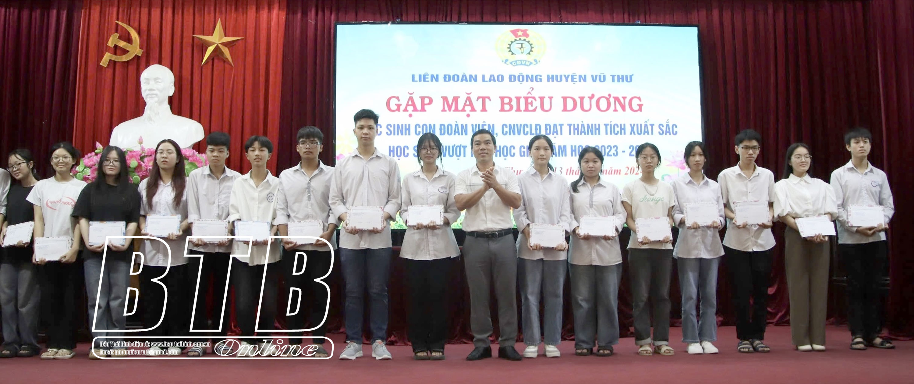 Sáng ngày 13/8, Liên đoàn Lao động (LĐLĐ) huyện Vũ Thư tổ chức gặp mặt, biểu dương con đoàn viên, công nhân viên chức lao động đạt thành tích cao trong học tập và vượt khó, học giỏi năm học 2023 - 2024.