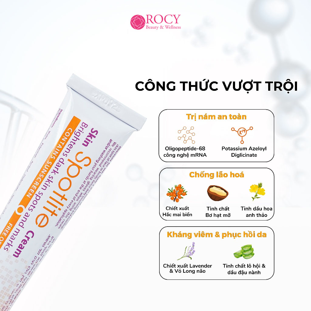 Kem trị nám Spotlite là một ví dụ về sản phẩm đáp ứng đầy đủ các tiêu chí lựa chọn kem trị nám. Sản phẩm được bào chế với Công nghệ m-RNA tiên tiến kết hợp cùng công nghệ Nano Liposome, giúp các hoạt chất thẩm thấu sâu vào da, tác động trực tiếp vào các tế bào sản sinh melanin, ức chế sản sinh nám, tàn nhang hiệu quả từ sâu bên trong.