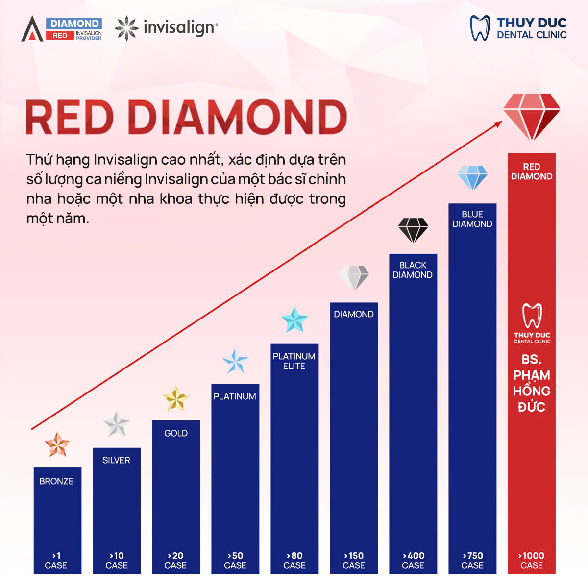 Invisalign được biết đến là phương pháp niềng răng trong suốt được ưa chuộng nhờ tính thẩm mỹ cao, ít đau và mang lại hiệu quả rõ rệt. Để đánh giá chuyên môn của các bác sĩ chỉnh nha Invisalign, hãng đã phân chia thứ hạng dựa trên số lượng ca điều trị thực hiện mỗi năm. Các cấp bậc từ thấp đến cao bao gồm: Bronze, Silver, Gold, Platinum, Platinum Elite, Diamond, Black Diamond, Blue Diamond và cao nhất là Red Diamond – dành cho những bác sĩ đạt hơn 1000 ca điều trị Invisalign mỗi năm.