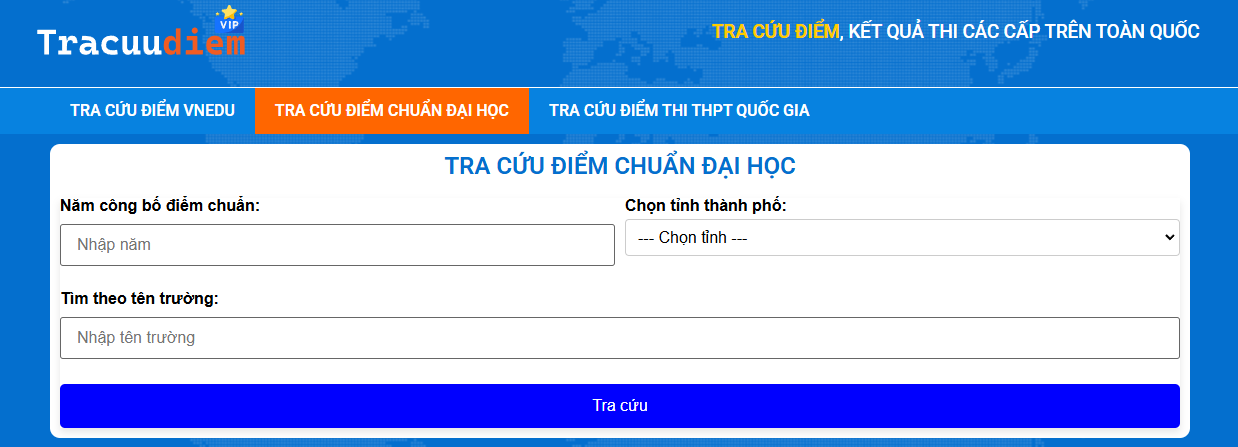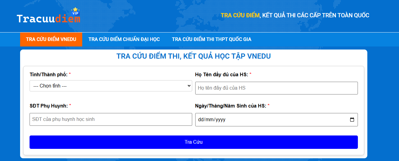 - Tra cứu điểm trên các website hỗ trợ tra cứu: Ngoài các kênh chính thức, bạn có thể sử dụng các website tra cứu điểm uy tín như tracuudiem.vip để kiểm tra điểm thi nhanh chóng và chính xác.