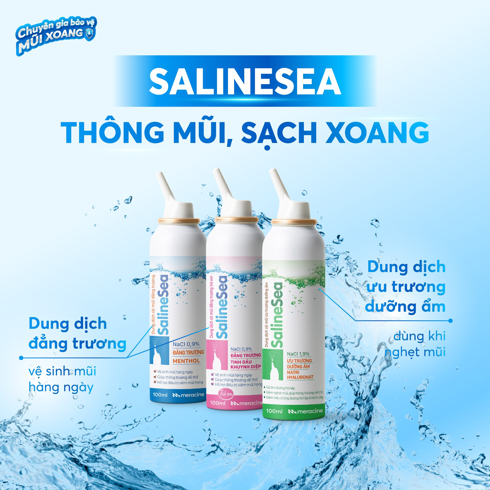 Dung dịch xịt mũi ưu trương dưỡng ẩm SalineSea: Với nồng độ 1,9% kết hợp với Natri Hyaluronat giúp cải thiện tình trạng sưng viêm niêm mạc mũi, giảm nghẹt hiệu quả.
