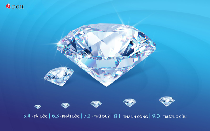- Kim cương 5.4 ly (Tài lộc): Là biểu tượng của tài lộc, thịnh vượng và hạnh phúc viên mãn, thu hút những nguồn năng lượng tích cực. Đây cũng là kích cỡ cân bằng giữa vẻ đẹp hoàn mỹ, không quá phô trương nhưng vẫn thu hút mọi ánh nhìn.