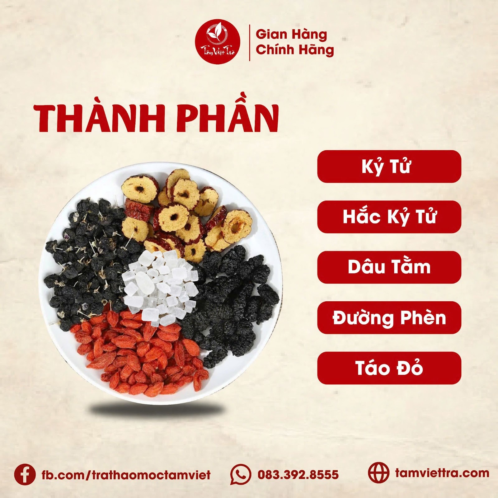 - Hắc kỳ tử: Theo đông y thì hắc kỷ tử có vị ngọt, tính bình quy kinh can, thận có tác dụng bổ can thận, ích khí, bổ huyết, làm sáng mắt. Được sử dụng từ lâu đời trị chứng huyết hư, can thận bất túc gây đau nhức xương, mệt mỏi, di tinh, hoa mắt, chóng mặt, mắt mờ.