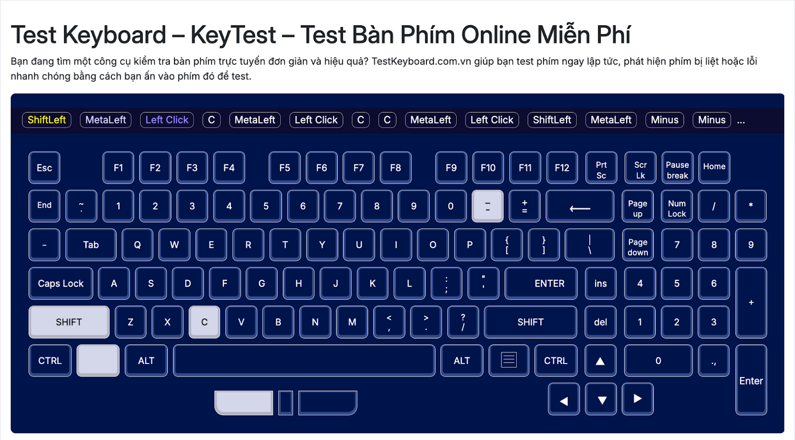 Test Keyboard online là công cụ hữu ích giúp bạn kiểm tra toàn bộ các phím trên bàn phím máy tính, laptop một cách nhanh chóng và chính xác. Với giao diện thân thiện và tính năng ưu việt, công cụ cho phép người dùng dễ dàng xác định các phím bị liệt, kẹt hoặc không hoạt động ổn định. Đặc biệt, TestKeyboard.com.vn hoàn toàn miễn phí, dễ sử dụng và không cần cài đặt phần mềm, đem lại trải nghiệm tiện lợi cho mọi đối tượng người dùng.