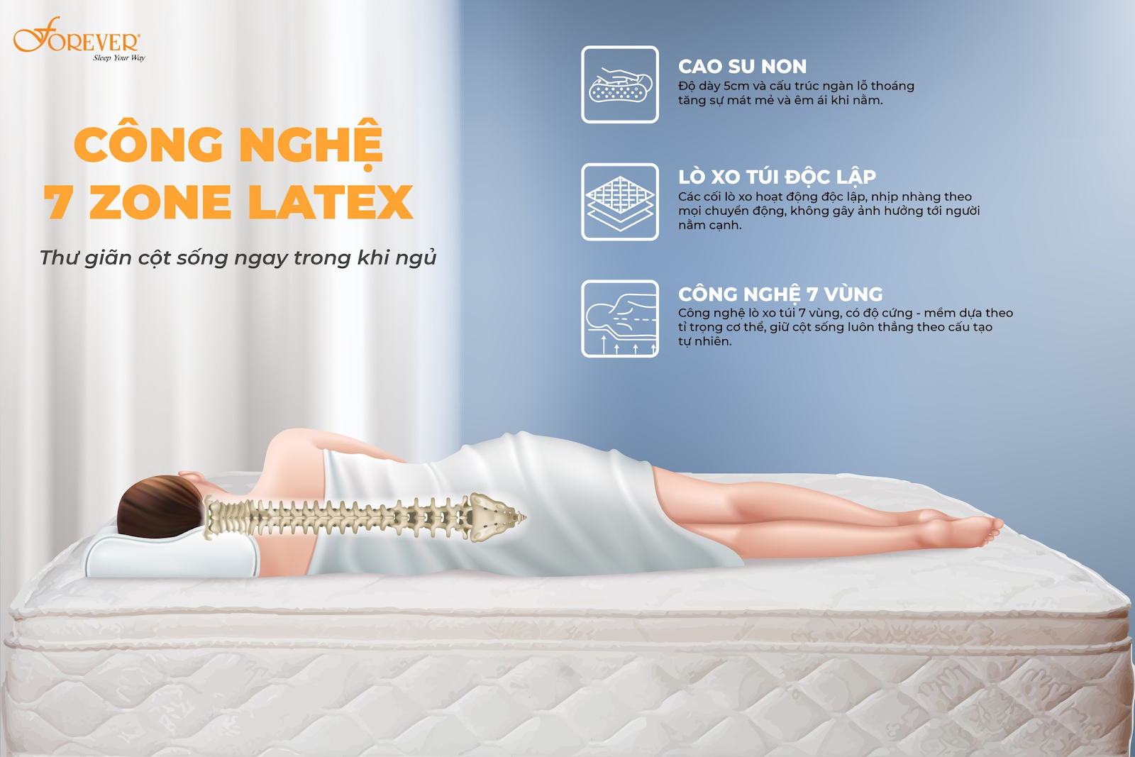 Không phải lúc nào cơ thể cũng nằm yên trong một tư thế suốt cả đêm. Đó là lý do vì sao Forever ứng dụng công nghệ 7-ZONES LATEX – với thiết kế lò xo túi độc lập chia thành 7 vùng nâng đỡ chuyên biệt, từ đầu, vai, lưng, hông đến chân. Mỗi khu vực có độ cứng – mềm khác nhau, giúp cột sống duy trì tư thế tự nhiên, giảm áp lực lên các điểm tì đè và hạn chế tình trạng đau mỏi sau giấc ngủ.