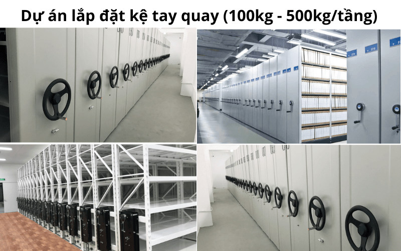 Kệ tay quay (Mobile Shelving) có khả năng di chuyển linh hoạt trên ray hoặc sử dụng cơ chế quay tay để tạo lối đi khi cần. Hệ thống này giúp tiết kiệm không gian hiệu quả, phù hợp với kho tài liệu, kho hồ sơ hoặc các mặt hàng có giá trị cao cần quản lý chặt chẽ.