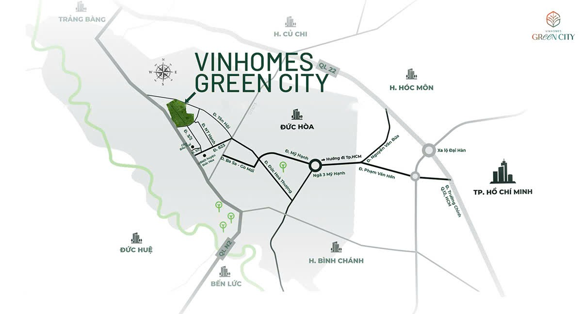 Khác với những vùng ven xa trung tâm, Hậu Nghĩa – nơi Vin Green City tọa lạc – chỉ cách Củ Chi, Quận 12 từ 25–30 phút di chuyển qua trục Quốc lộ N2, đường Tỉnh lộ 8, Quốc lộ 22.