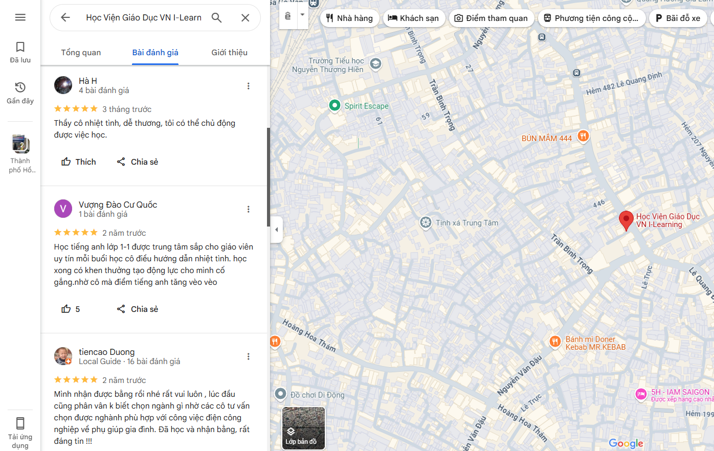 Học viên đánh giá tích cực về VN I-Learning trên Google Maps
