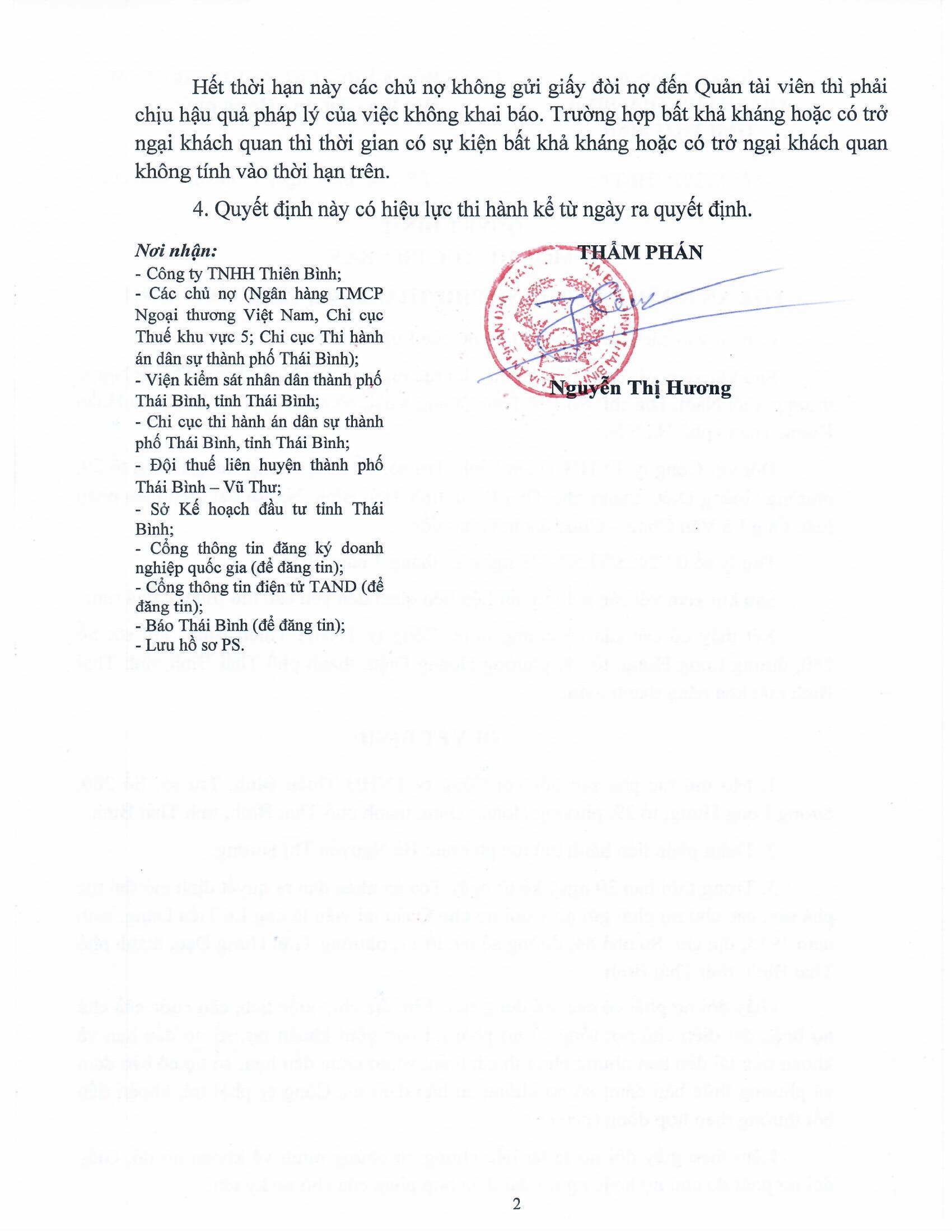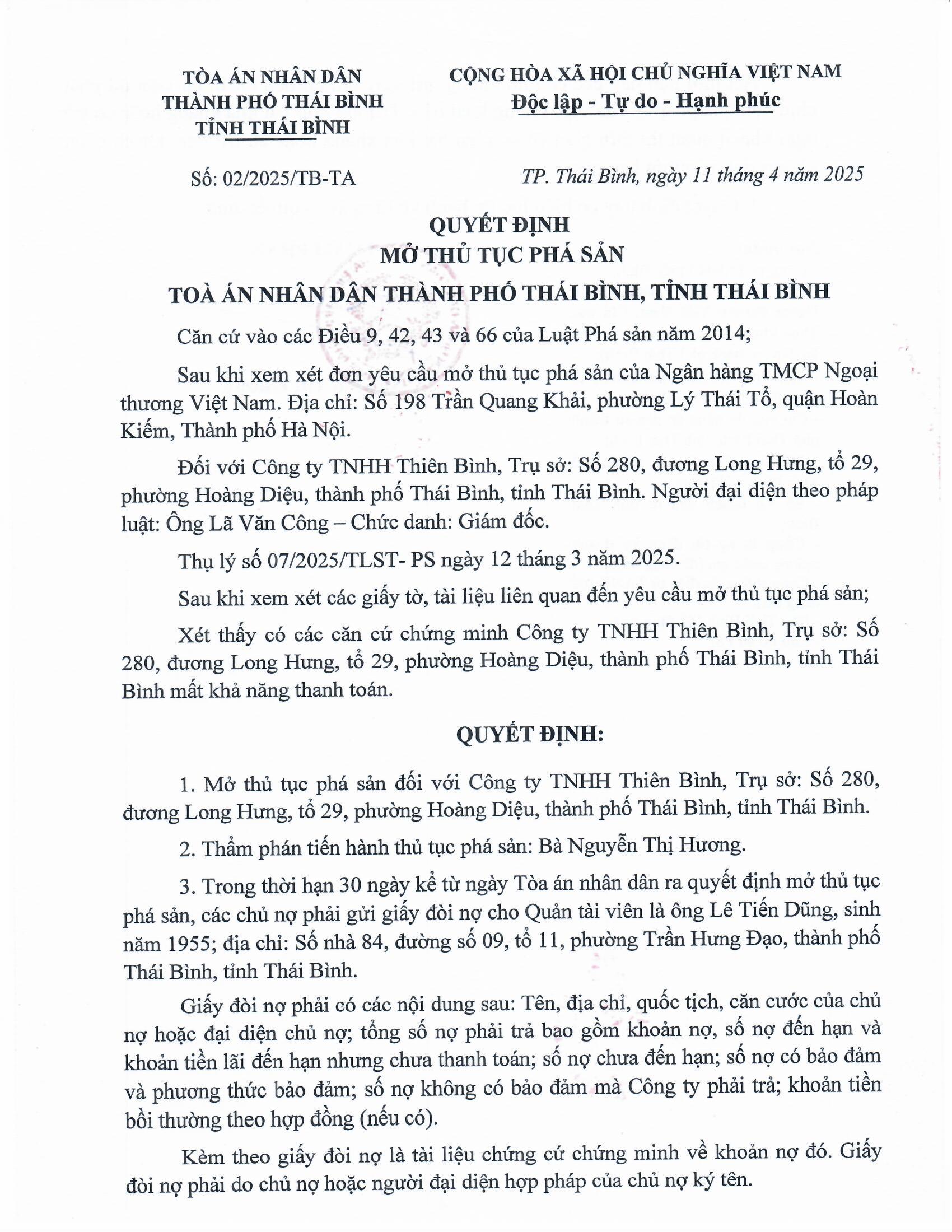 Quyết định mở thủ tục phá sản đối với Công ty TNHH Thiên Bình