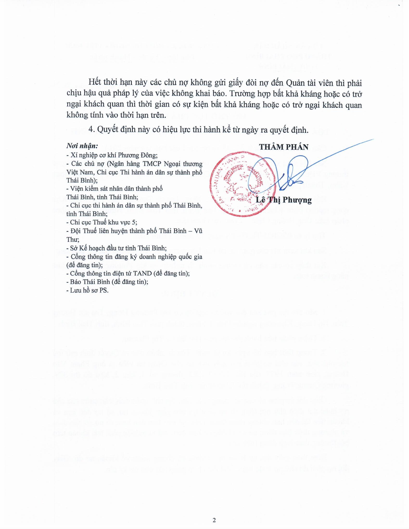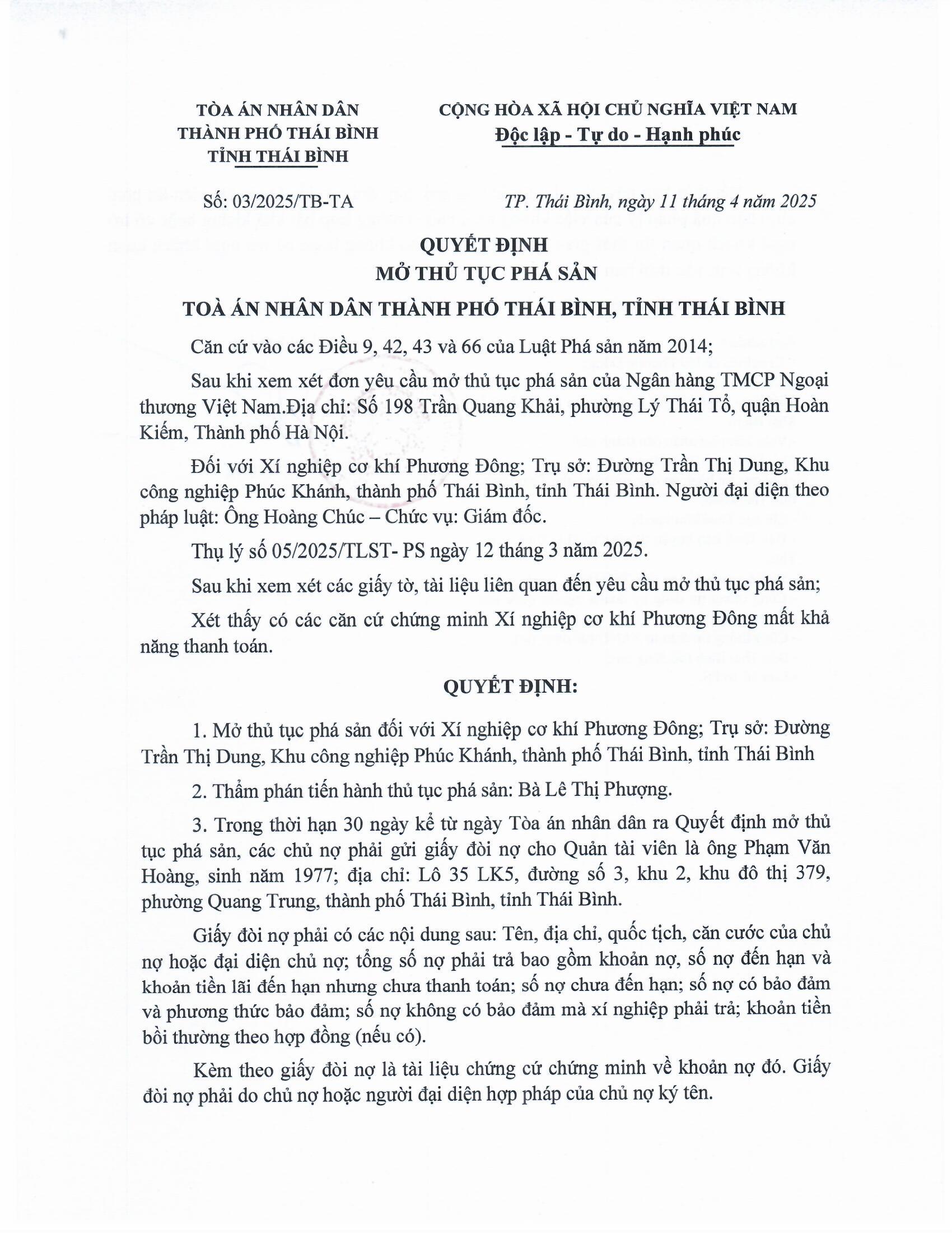 Quyết định mở thủ tục phá sản đối với Xí nghiệp cơ khí Phương Đông