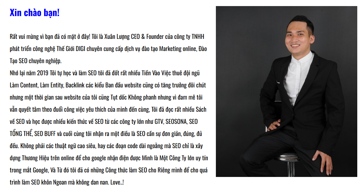 Được thành lập bởi CEO Lưu Xuân Lượng, Thế Giới DIGI là một trong những công ty hàng đầu tại Việt Nam về marketing tổng thể và đào tạo SEO. Với hơn 6 năm kinh nghiệm thực hiện các dự án SEO lớn nhỏ và hỗ trợ doanh nghiệp phát triển bền vững trên môi trường online, Thế Giới DIGI hoạt động với triết lý “Uy tín, tận tâm, chuyên nghiệp”. Hành trình của ông Lưu Xuân Lượng, từ một người tự học SEO đến chuyên gia, đã truyền cảm hứng cho phương pháp đào tạo tại đây. Triết lý “SEO khôn ngoan mà không gian nan” giúp học viên tiếp cận SEO một cách thông minh, thực tế, tập trung vào dự án thực hành để đạt kết quả ngay trong quá trình học.