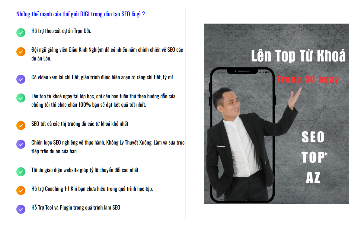 Giảng viên giàu kinh nghiệm: Đội ngũ giảng viên có nhiều năm kinh nghiệm, luôn đồng hành sát sao, cung cấp phương pháp SEO đơn giản dựa trên số liệu thực tế và các dự án thành công.