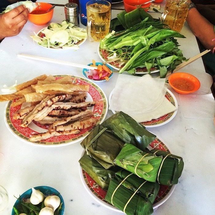 Nem nướng ở đây thơm, mềm, ăn kèm bánh tráng, rau sống, xoài xanh, đồ chua và chén nước chấm sánh mịn pha từ đậu phộng, gan heo, gạo nếp… Một phần ăn đầy đủ có thể khiến bạn “no tới tối”.
