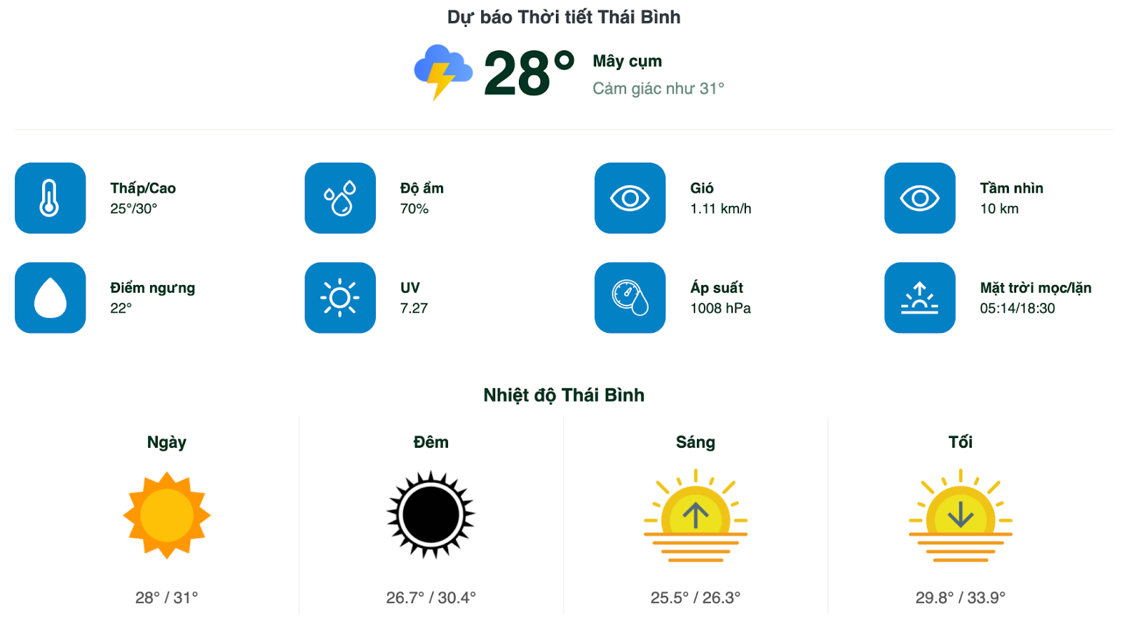 Trang web Thời Tiết Hôm Nay là một trong những kênh cung cấp thông tin dự báo thời tiết uy tín và chi tiết nhất dành cho người dân Thái Bình và cả nước. Tại đây, người dùng có thể dễ dàng cập nhật các dữ liệu như nhiệt độ, độ ẩm, lượng mưa, tốc độ gió, mức độ ô nhiễm không khí,... theo từng giờ, từng ngày và thậm chí dự báo dài hạn.