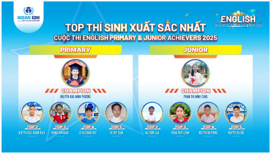 Từ nhiều năm nay, English Primary & Junior Achievers đã trở thành cuộc thi tiếng Anh thường niên lớn nhất do Ocean Edu tổ chức, với sự đồng hành của hàng trăm trường học trong cả nước. Năm 2025, cuộc thi trở lại với quy mô mở rộng, đề thi chuẩn hóa theo khung quốc tế, thu hút hàng chục nghìn học sinh từ lớp 3 đến lớp 8 đăng ký tham gia. Đây là sân chơi lý thú, nơi các tài năng “nhí” có cơ hội được thể hiện khả năng tiếng Anh và kiến thức hiểu biết của bản thân.