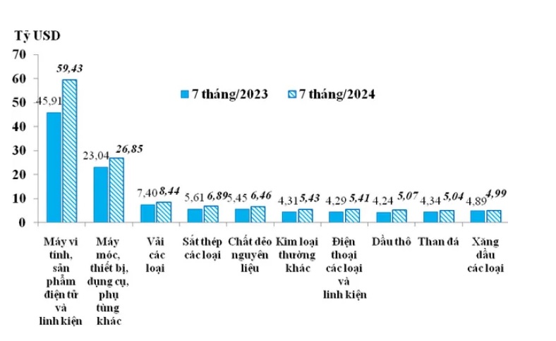 Lũy kế, 7 tháng/2024, tổng trị giá nhập khẩu hàng hóa của Việt Nam đạt 212,96 tỷ USD, tăng 18.5%, tương ứng tăng 33,32 tỷ USD so với cùng kỳ năm 2023. Trong đó, ghi nhận tăng mạnh nhất là các nhóm hàng máy vi tính, sản phẩm điện tử và linh kiện tăng 13,52 tỷ USD (tăng 29,4%); máy móc ,thiết bị, dụng cụ và phụ tùng tăng 3,81 tỷ USD (tăng 16,5%); sắt thép các loại tăng 1,28 tỷ USD (tăng 22,9%); điện thoại các loại và linh kiện tăng 1,12 tỷ USD (tăng 26,3%).