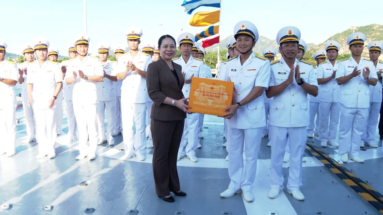 Phó Chủ tịch nước Võ Thị Ánh Xuân tặng quà Lữ đoàn 146, Quân chủng Hải quân. (Ảnh: CTV HQ).